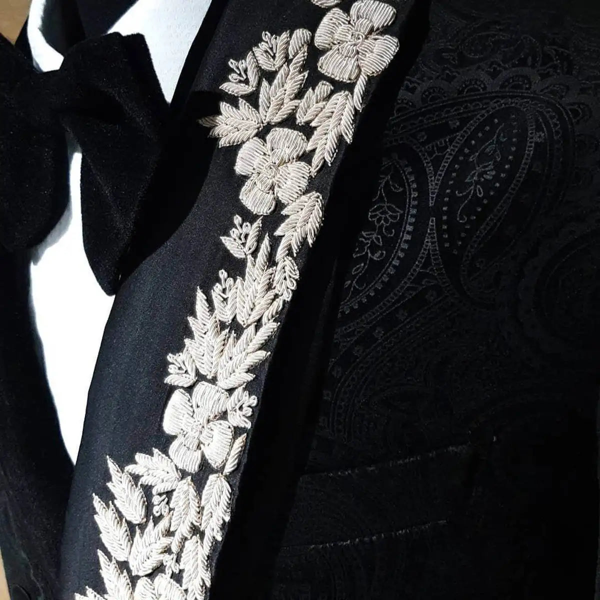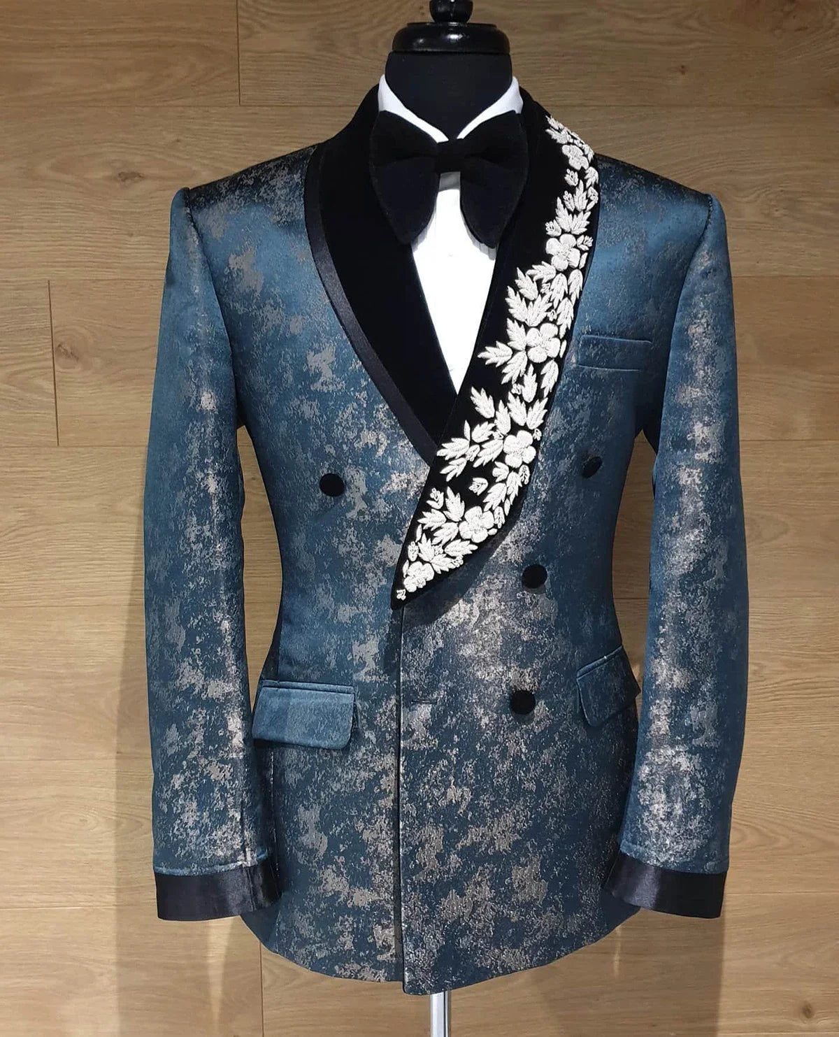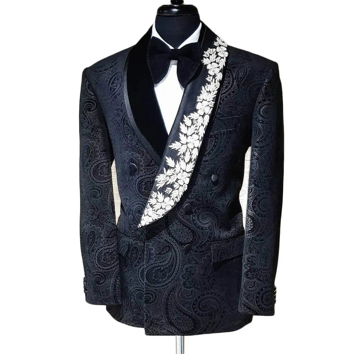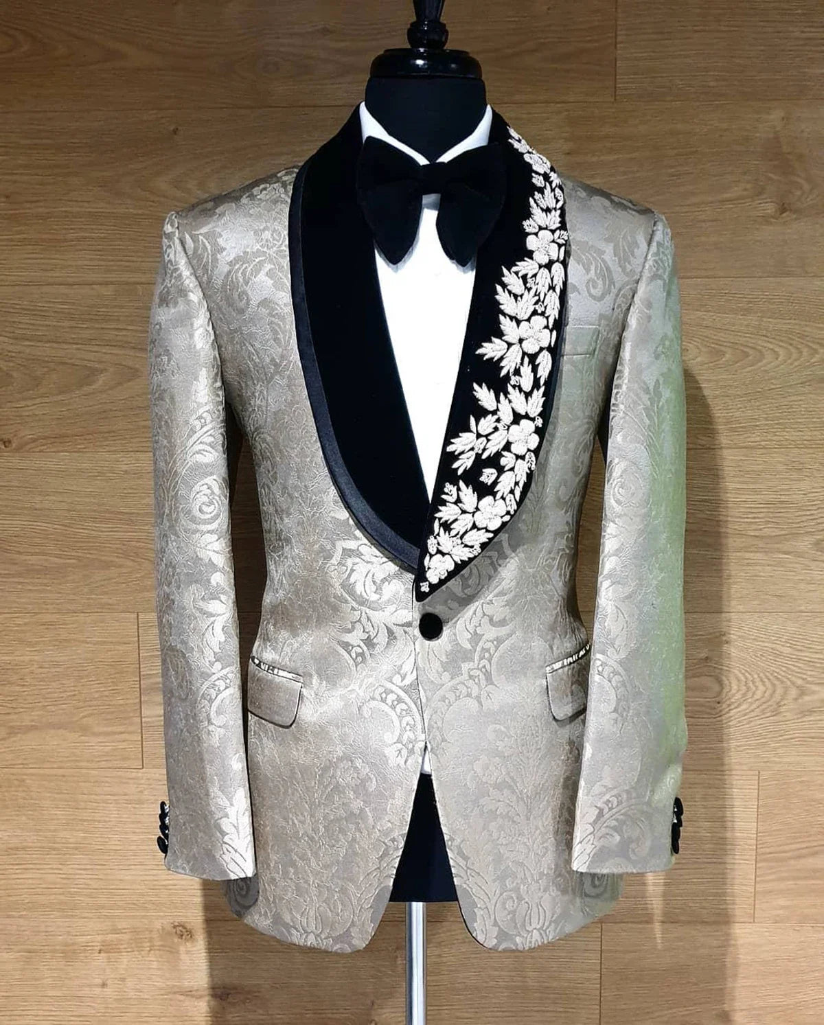 Make a refined, vintage-inspired statement with this tailor-made 2-piece men’s suit featuring ornamental appliques and a classic shawl lapel — designed for weddings, formal occasions, galas, and any event where timeless elegance matters. The set includes a fully customized blazer and coordinating black trousers, crafted to your exact measurements for an impeccable fit.