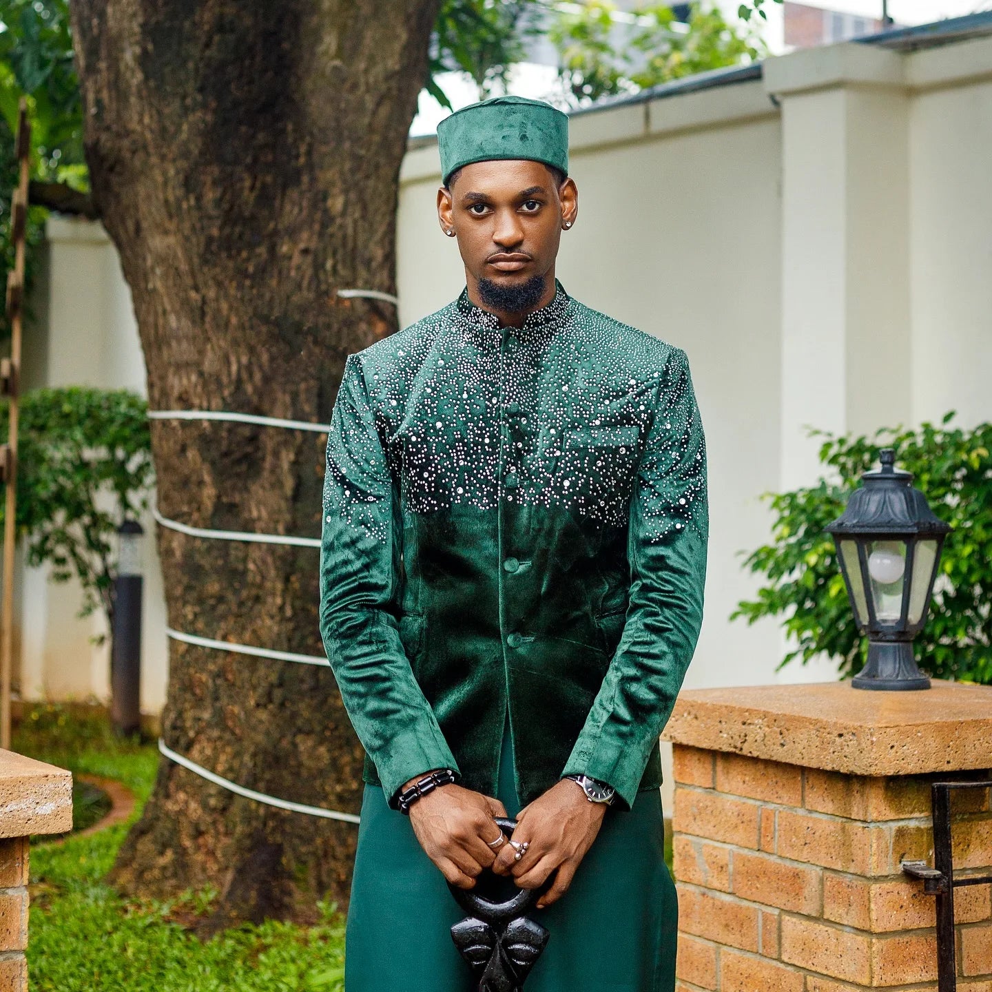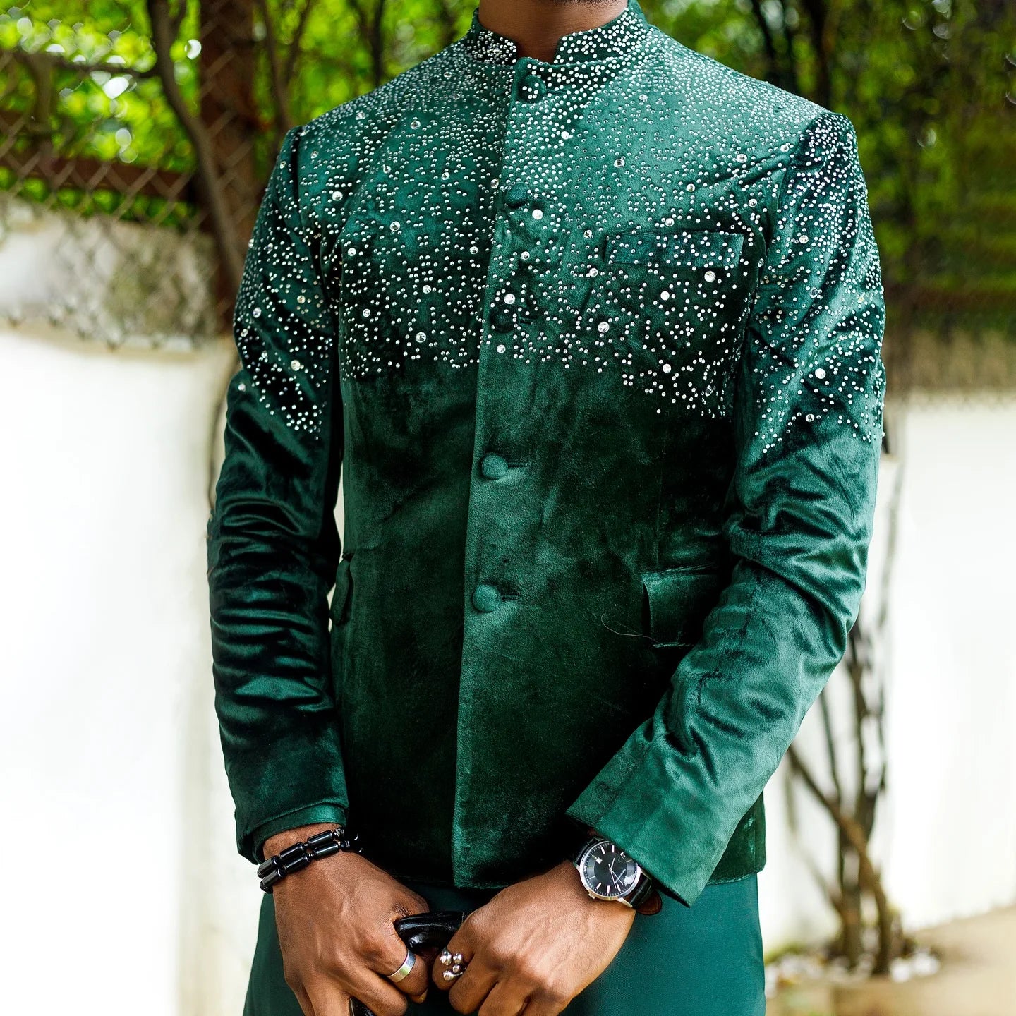 Muslim Men's Suit Beaded Tailor-Made 2 Pieces Set Jacket Rhinestone Middle East Velvet Single Breasted Customized Coat Pants