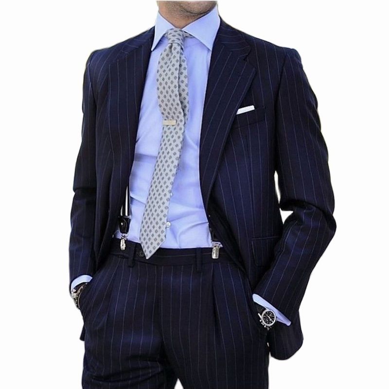 Pinstripe Suit Men 2 Pieces Navy Blue Slim Fit Business Blazer Formal Groom Wedding Tuxedos Trajes de Hombre