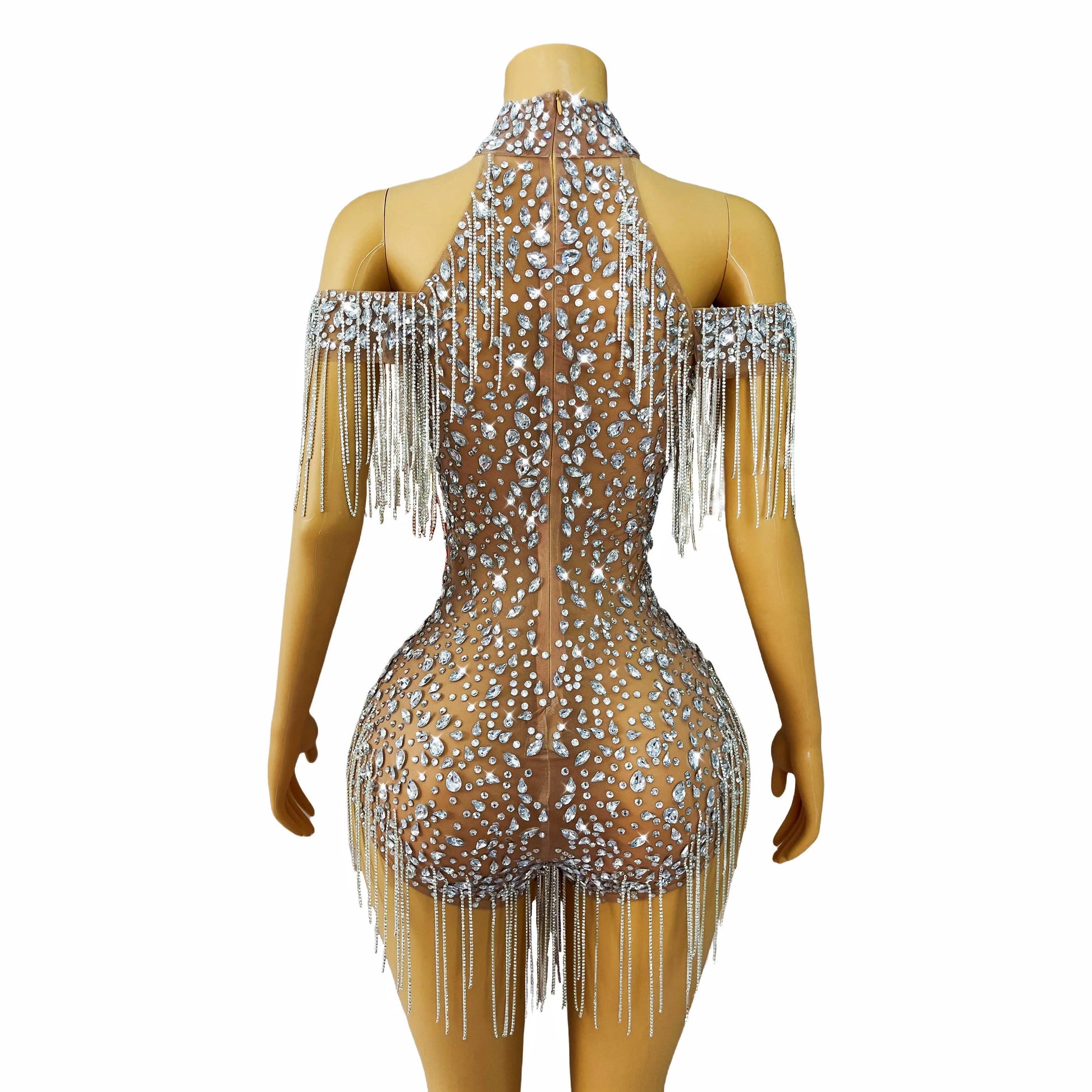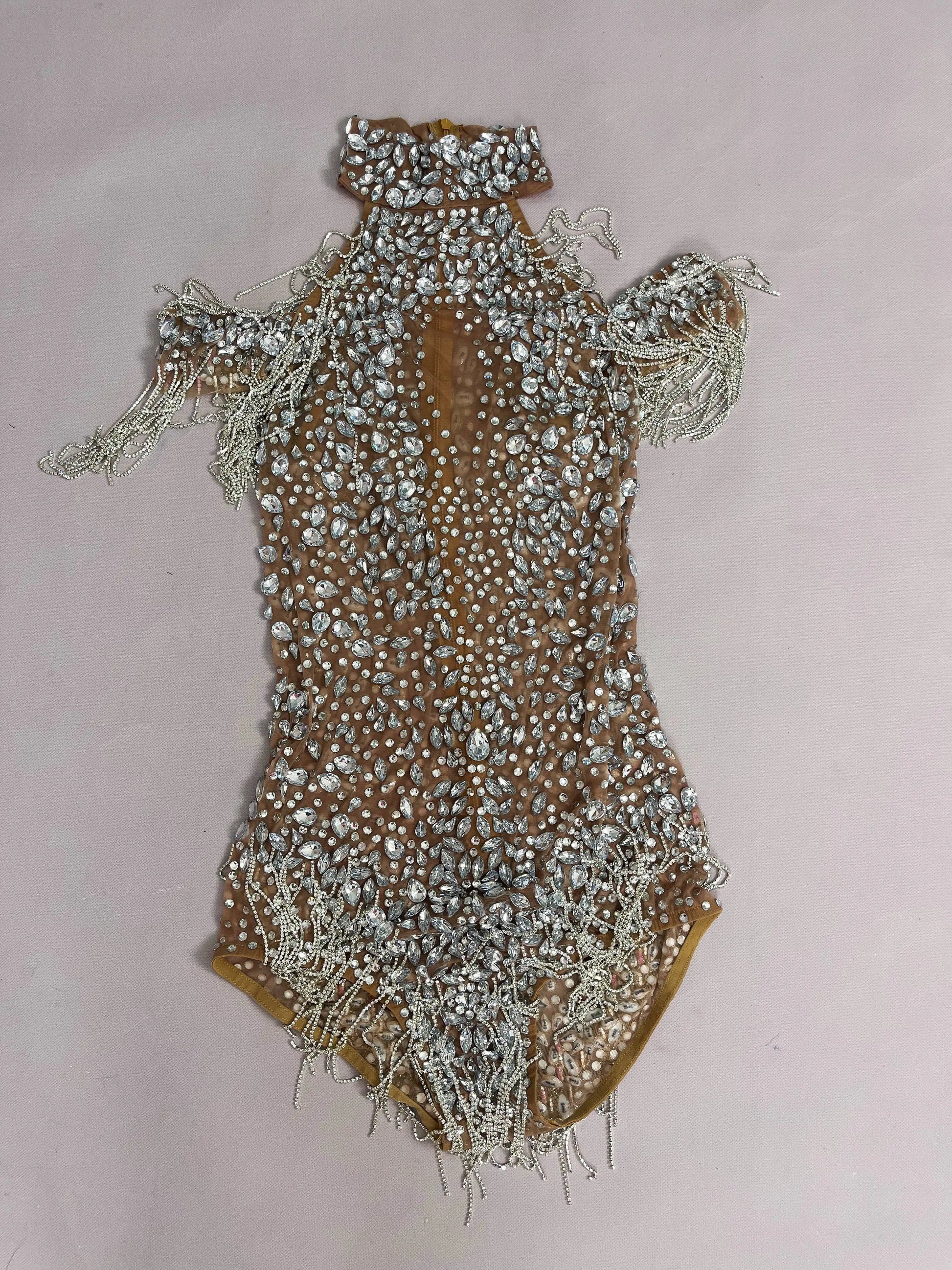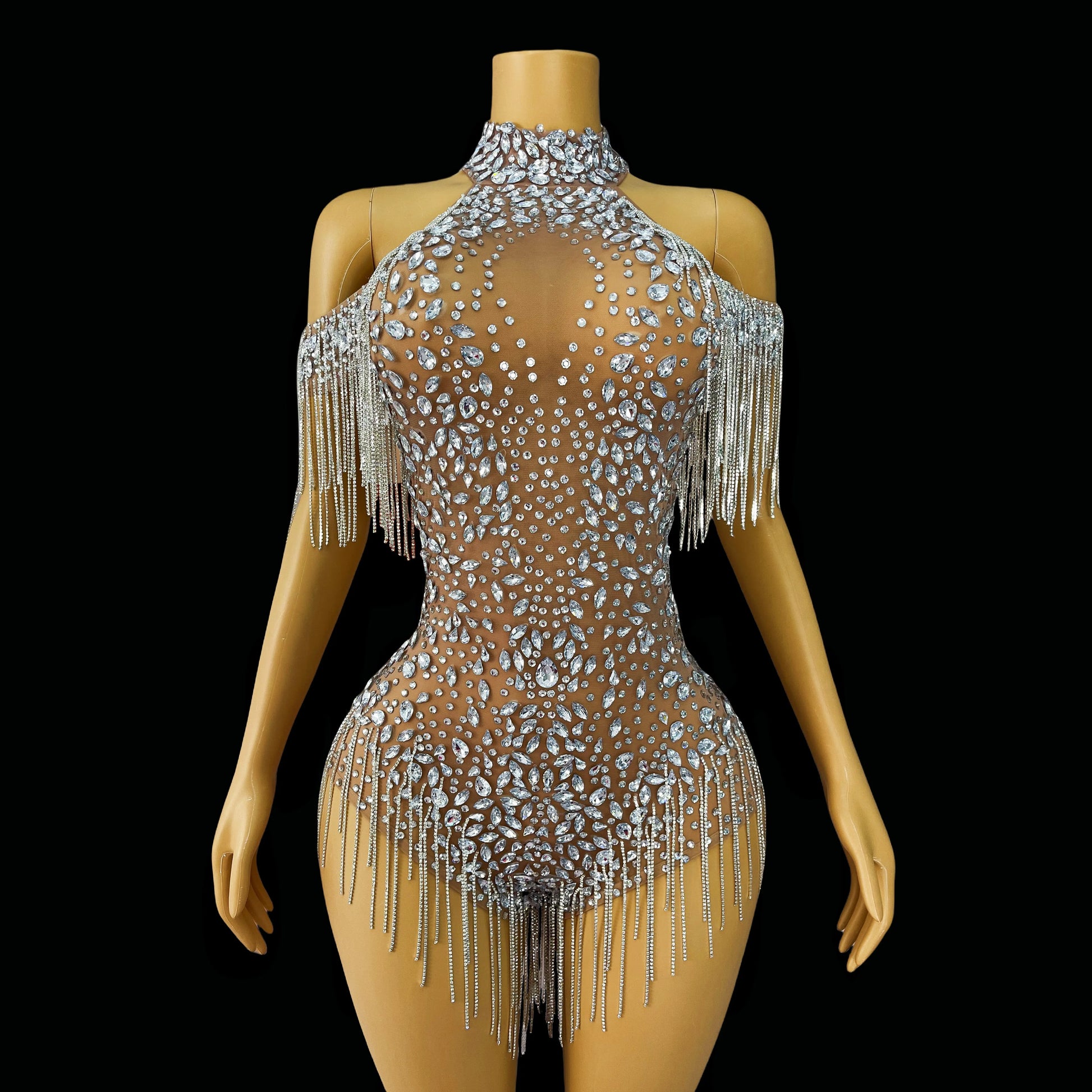 Step into the spotlight with this dazzling off-the-shoulder costume, adorned with shining rhinestones and crystal chain details for maximum glamour. Designed with high slits ("forks") to elongate your silhouette, this show-stopping piece is perfect for women ready to own the stage—whether you’re a singer, dancer, or party performer. The sparkling embellishments catch the light with every move, making this dramatic outfit ideal for unforgettable performances and special celebrations. Radiate confidence, elegance, and star power at every event!