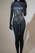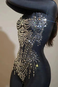 Own the spotlight in this black sexy jumpsuit, fully embellished with dazzling diamonds for maximum sparkle on stage. The slimming, figure-hugging design creates a bold and confident silhouette, making it the ultimate choice for nightclub performances, bar shows, gogo dancers, party girls, or group acts. With its wetsuit-inspired style and glamorous shine, this outfit guarantees you’ll stand out and captivate every audience.