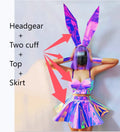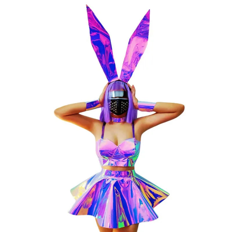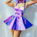Turn heads with this purple laser short dress and matching headgear, perfect for anime cosplay and bold party looks. Designed for women, this eye-catching outfit shimmers with a holographic finish, making it ideal for bar and nightclub performances, gogo dancing, Halloween, festivals, or any sexy stage wear occasion. Get ready to stand out and sparkle all night!