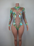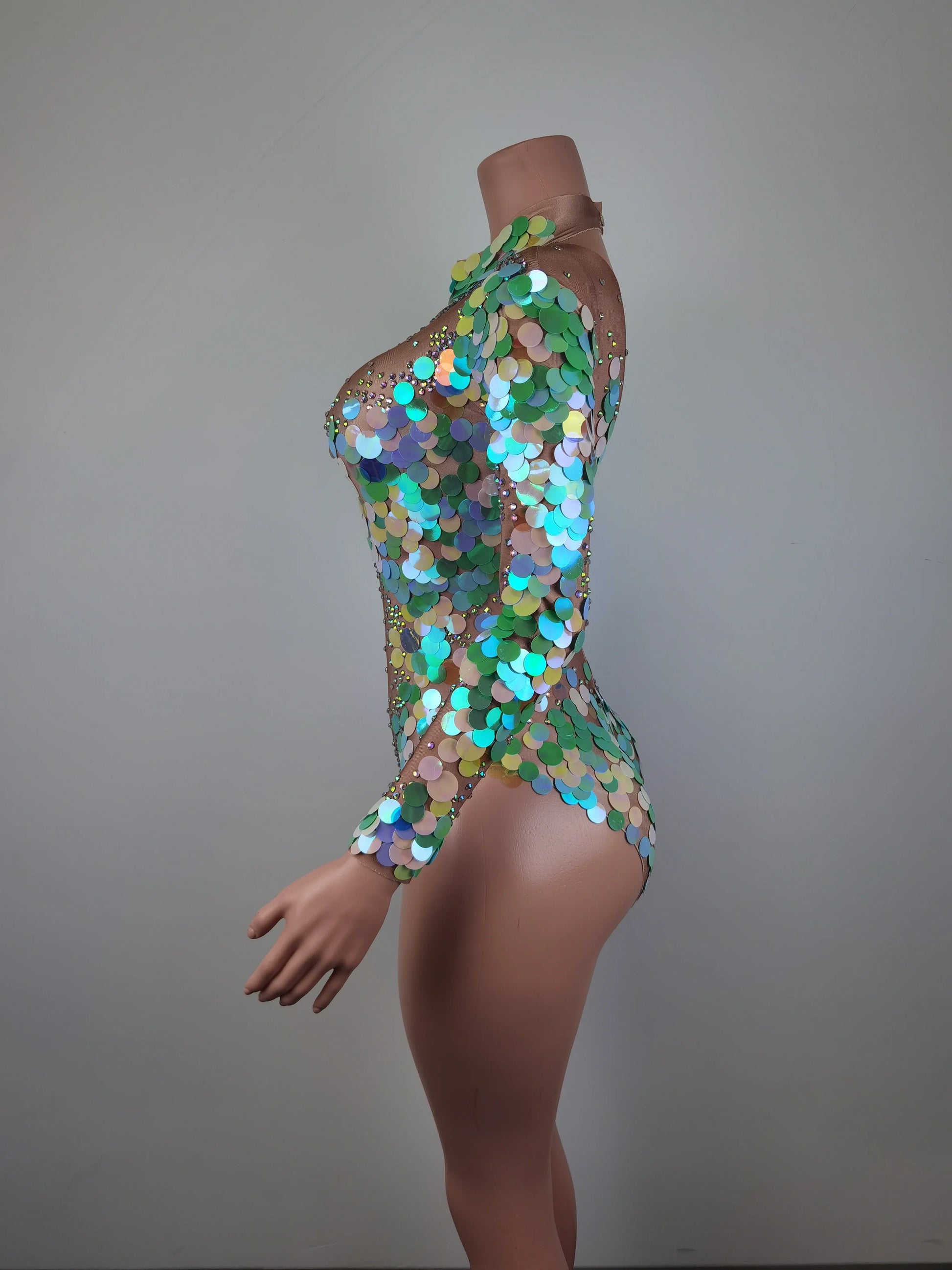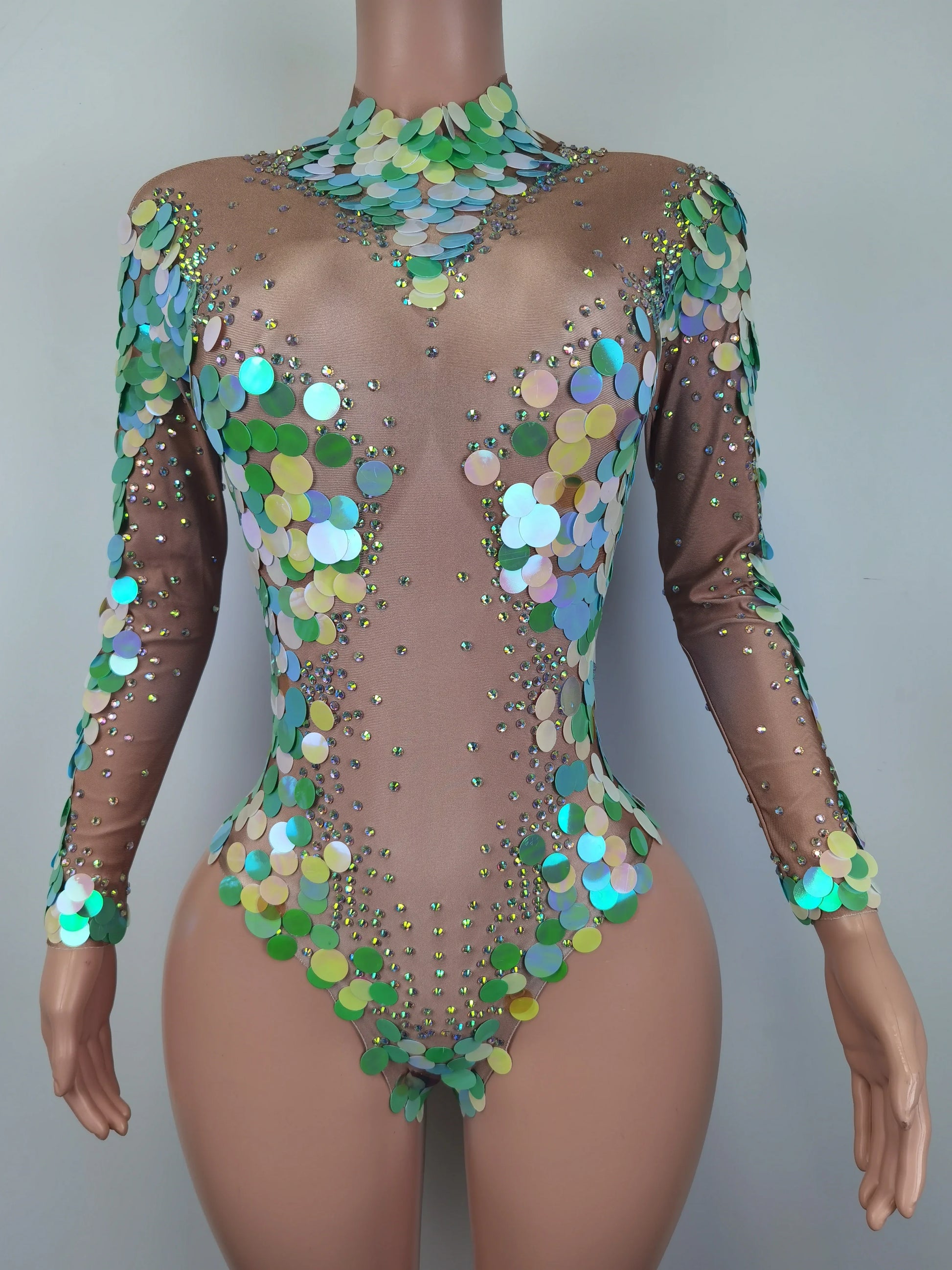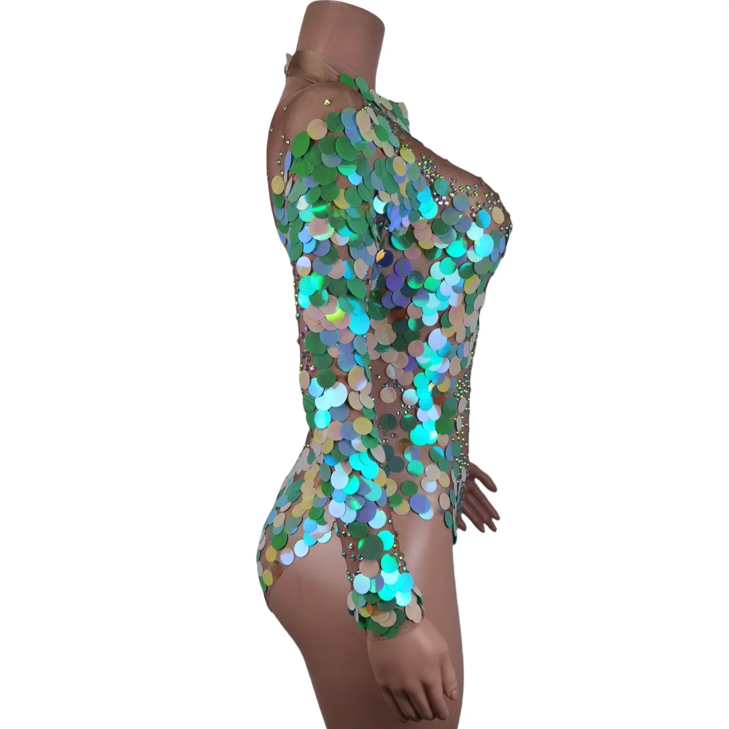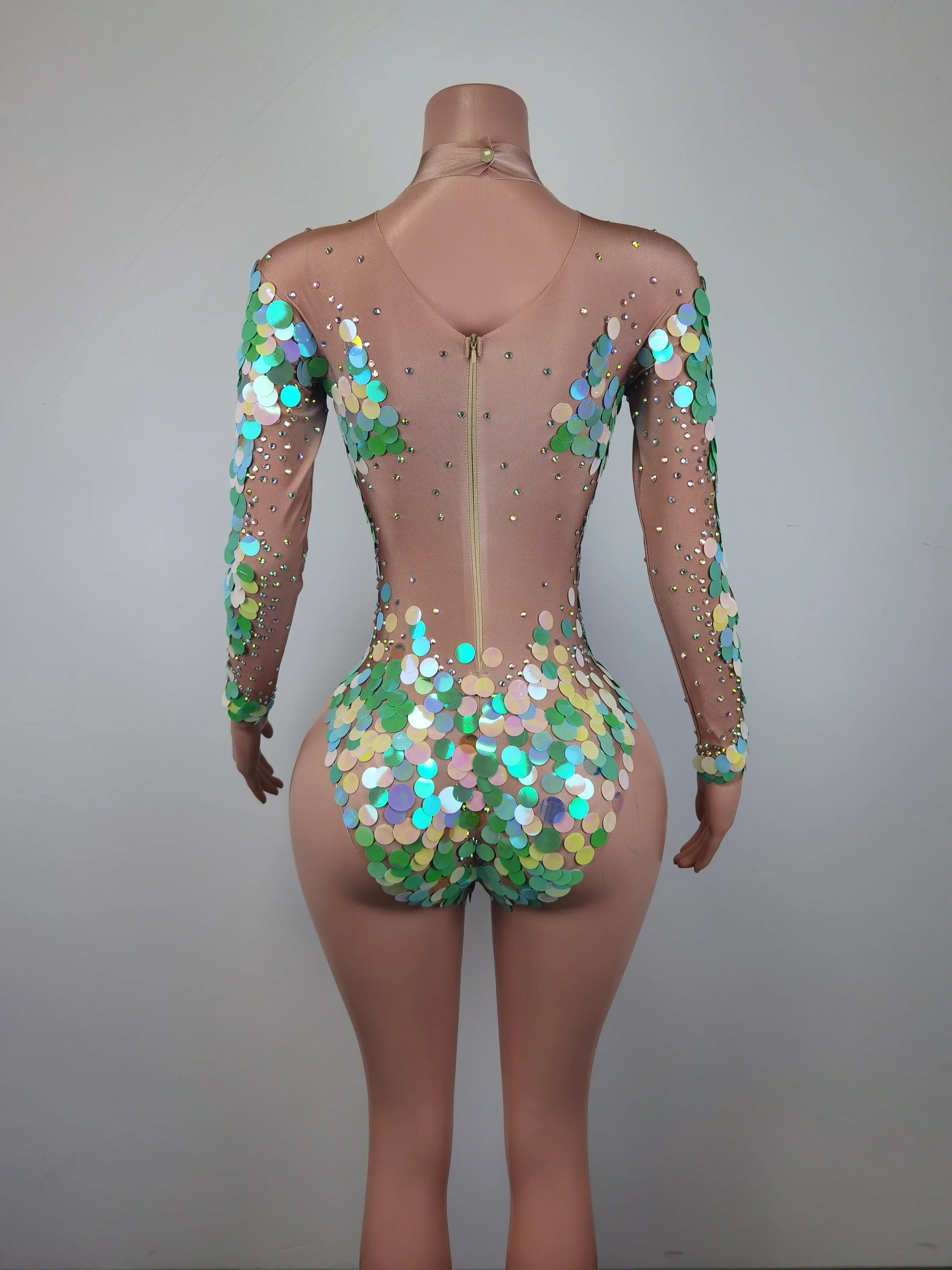 Sparkle and stand out in this dazzling sequin jumpsuit, designed especially for ladies who love to shine on stage or at parties. Featuring a sexy bodycon fit, sheer mesh panels, and sparkling rhinestone accents, this jumpsuit is perfect for jazz dance performances, club events, or any night when you want all eyes on you. Flaunt your confidence and style with this stunning party romper that combines glamour and comfort for an unforgettable look.