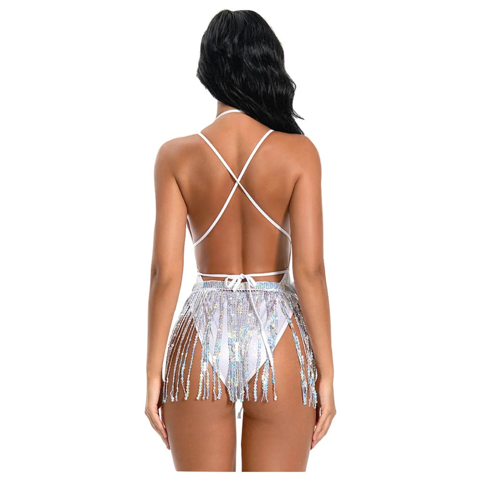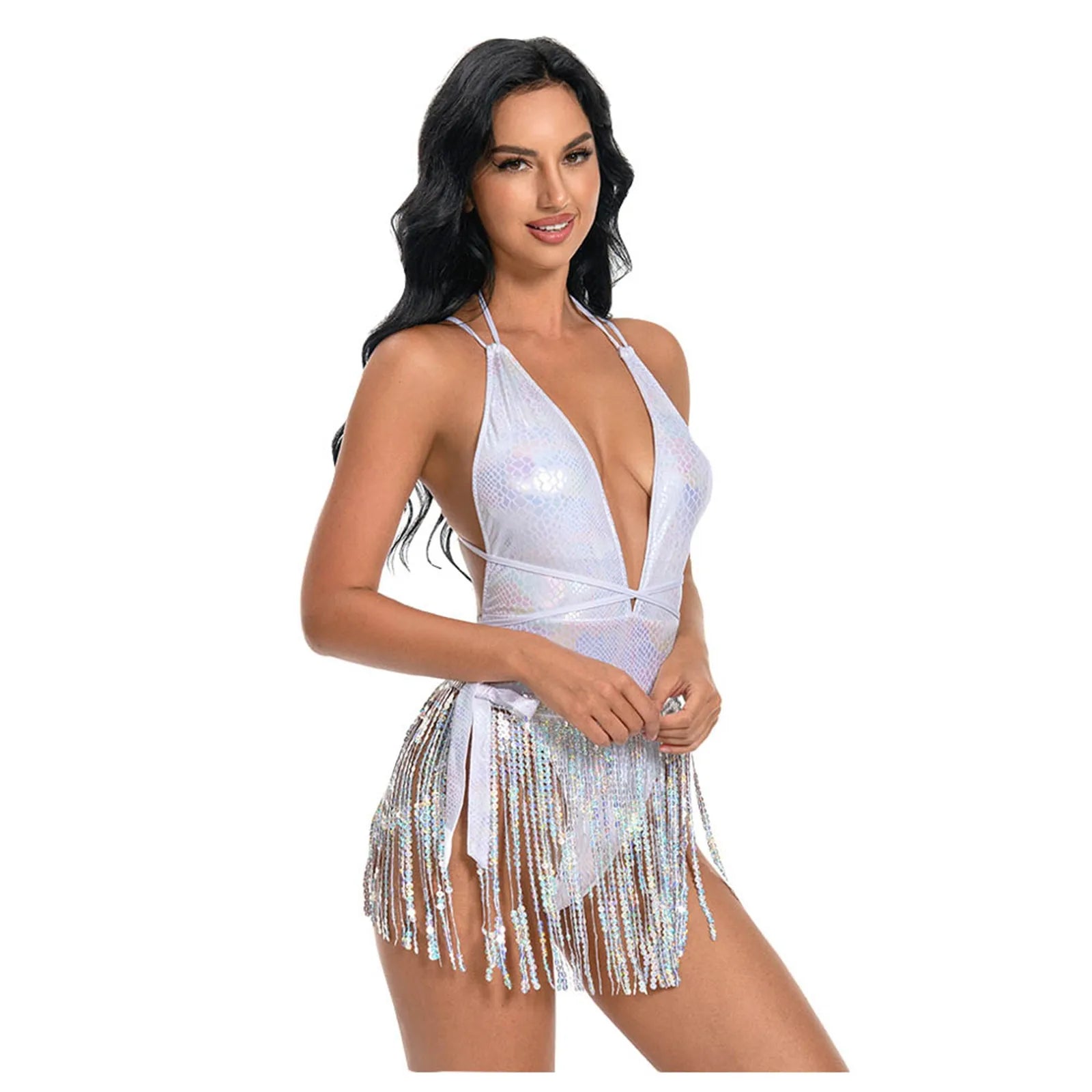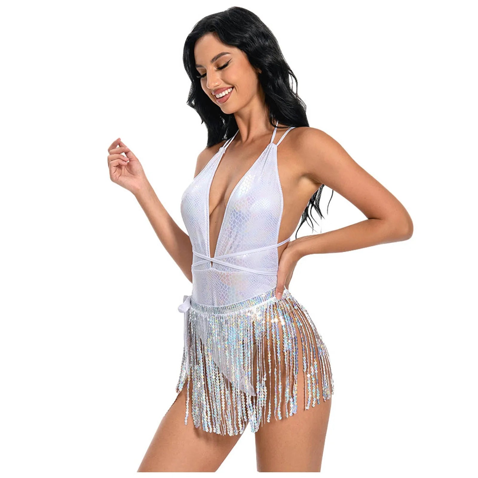 Make a statement with this sexy bikini set and pole dance costume, designed for bold style and ultimate comfort. This stunning white one-piece bodysuit features a daring backless design and comes with a playful tassel hip scarf, perfect for showcasing your moves. Whether you're performing as a gogo dancer, hitting the beach, or attending a rave or party, this outfit offers both allure and flexibility. Stand out wherever you go with this irresistible and eye-catching ensemble.