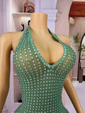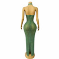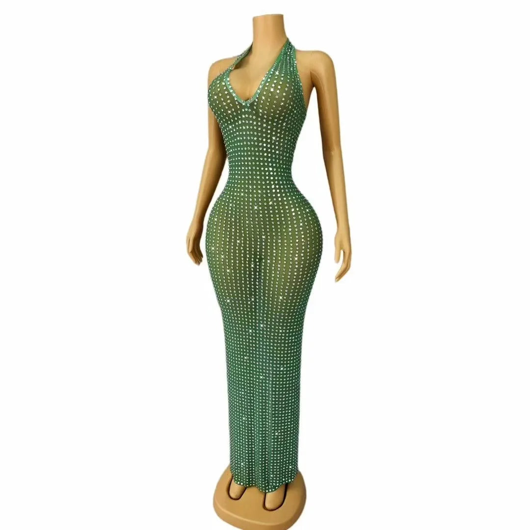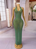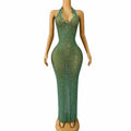Sexy Blingbling Rhinestones Halterneck Gown V-neck Backless Dress Women Evening Prom Party Outfit Stage Photoshoot Costume