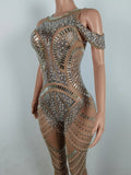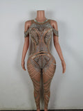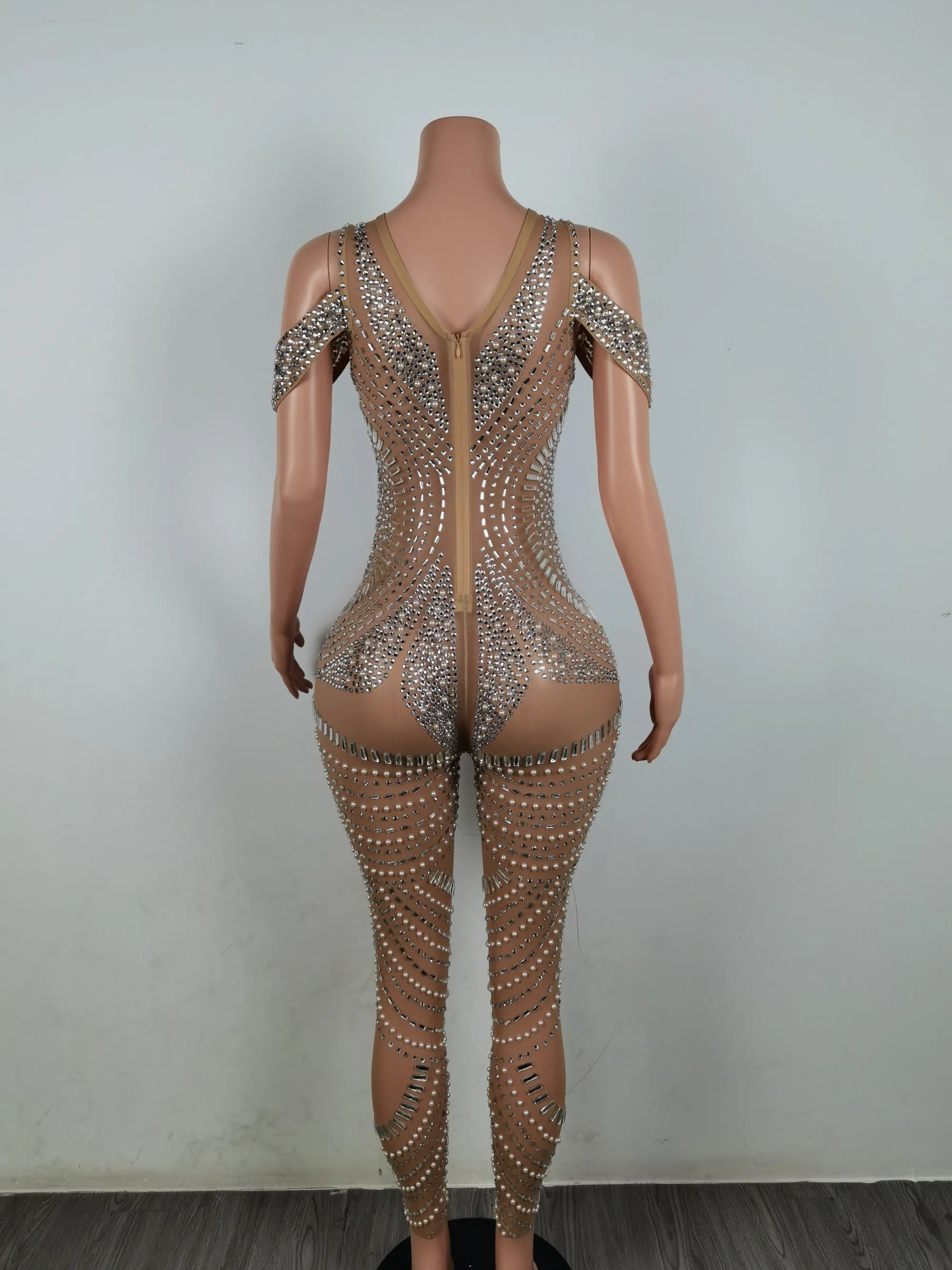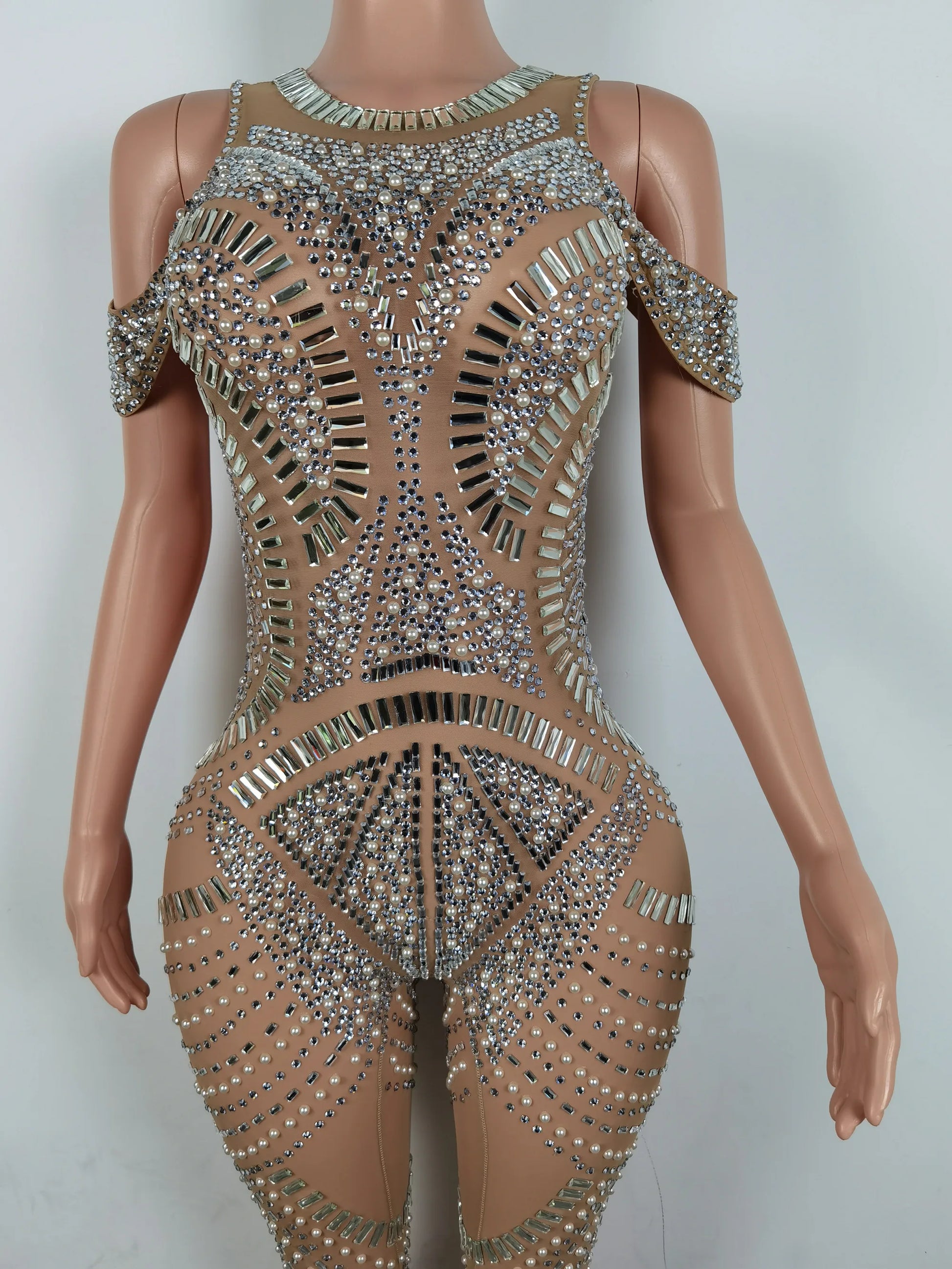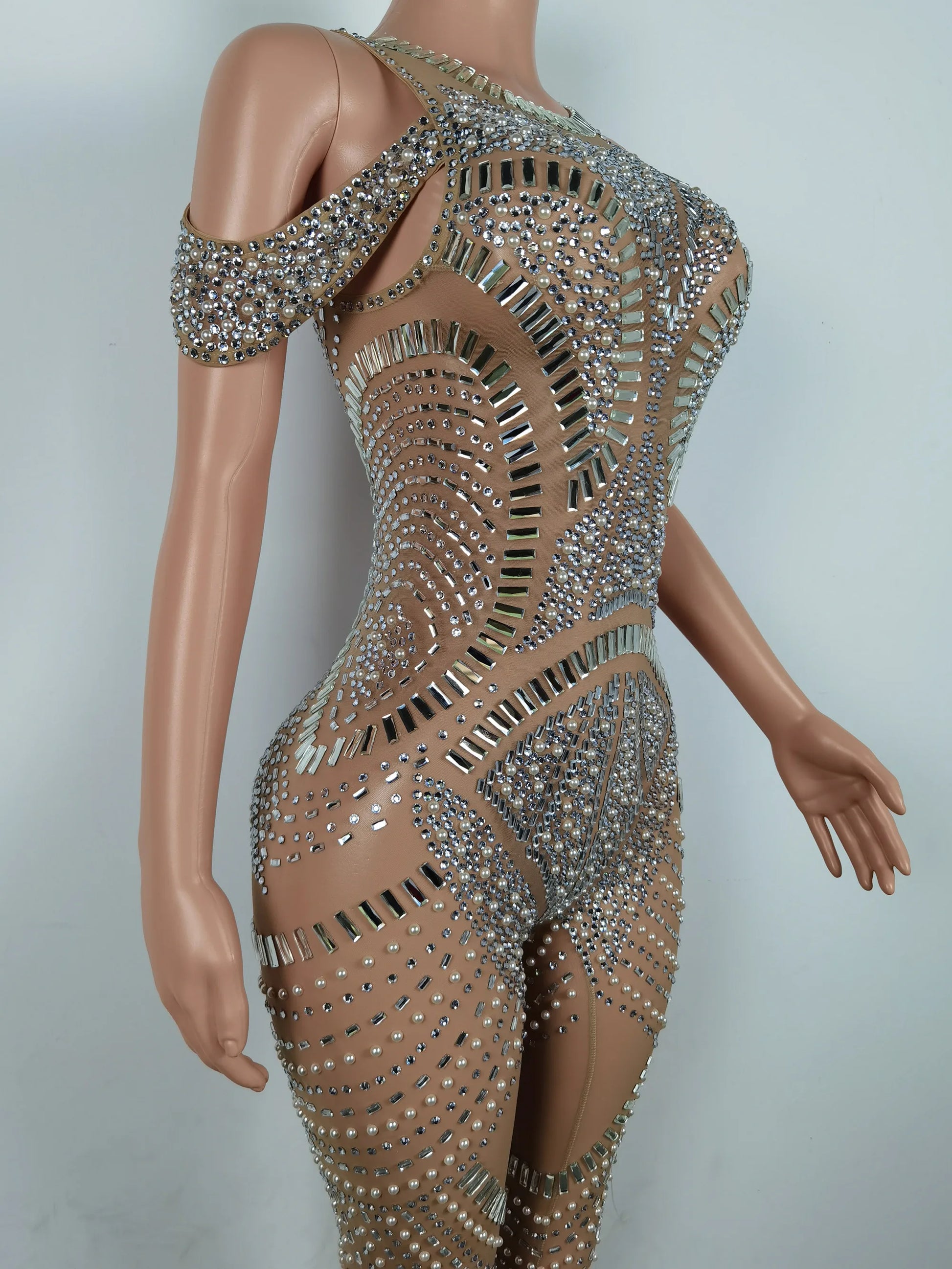 Sexy Crystals Pearls Rompers Transparent Bodysuit Stripper Dancewear Pole Dance Leotard Plus Size Women Club One Piece Jumpsuits