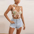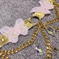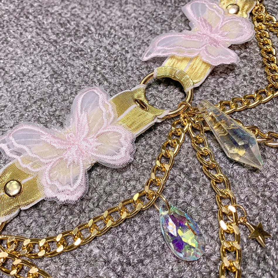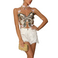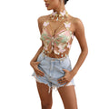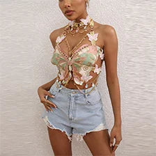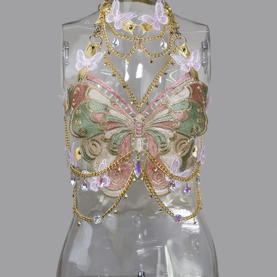 Show off your playful side with this sexy pink embroidered butterfly crop top. Designed with a flattering halter neck and daring backless cut, this women’s vest top features a draped metal chain and a sparkling crystal pendant for a touch of glamour. Complete with a matching choker, this unique and eye-catching piece is perfect for parties, festivals, or stylish nights out.