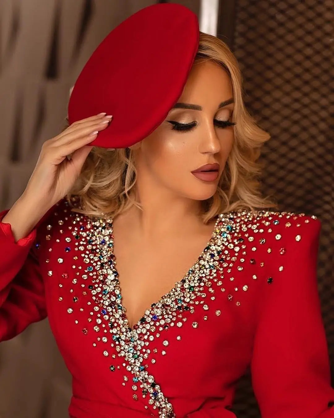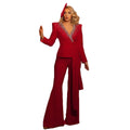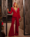 Dazzling Red V-Neck Beaded Women's Suit Set with Belt - Vintage Blazer and Flared Pants for Parties, Prom, and Streetwear Fashion