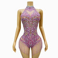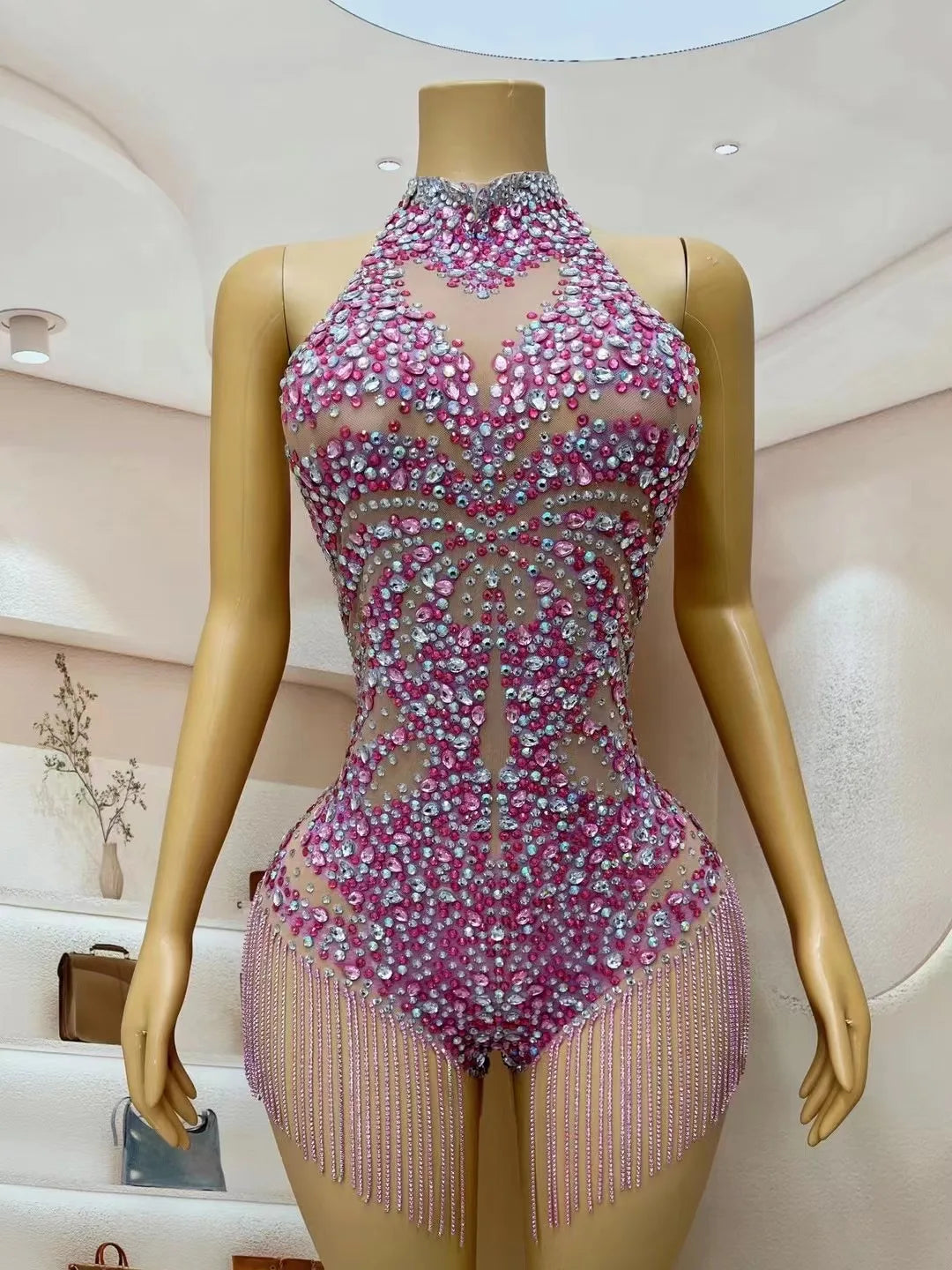 Sexy Flashing Pink Rhinestones Crystals Chains Fringes Leotard Evening Birthday Backless Bodysuit Club Dance Photoshoot Outfit