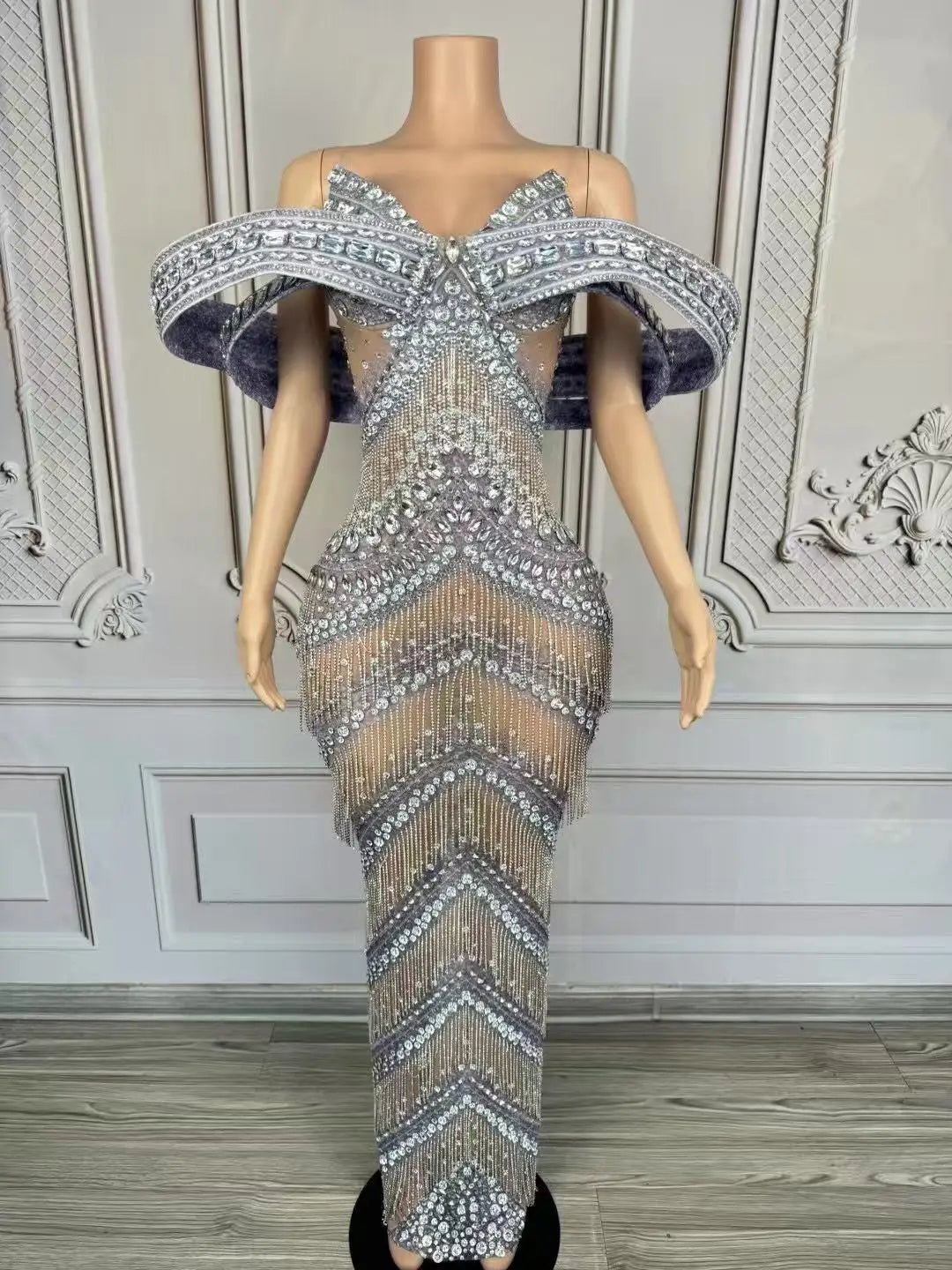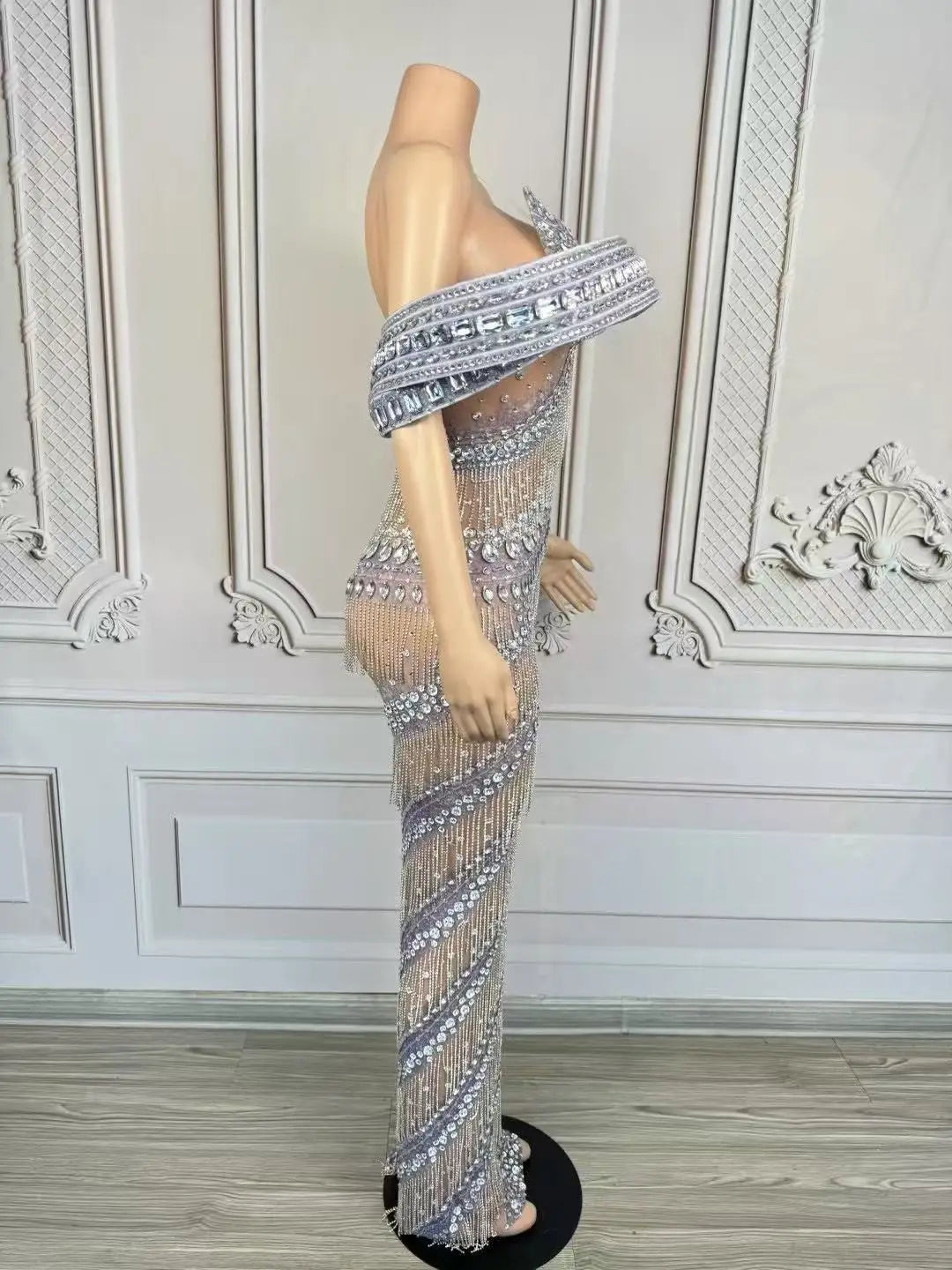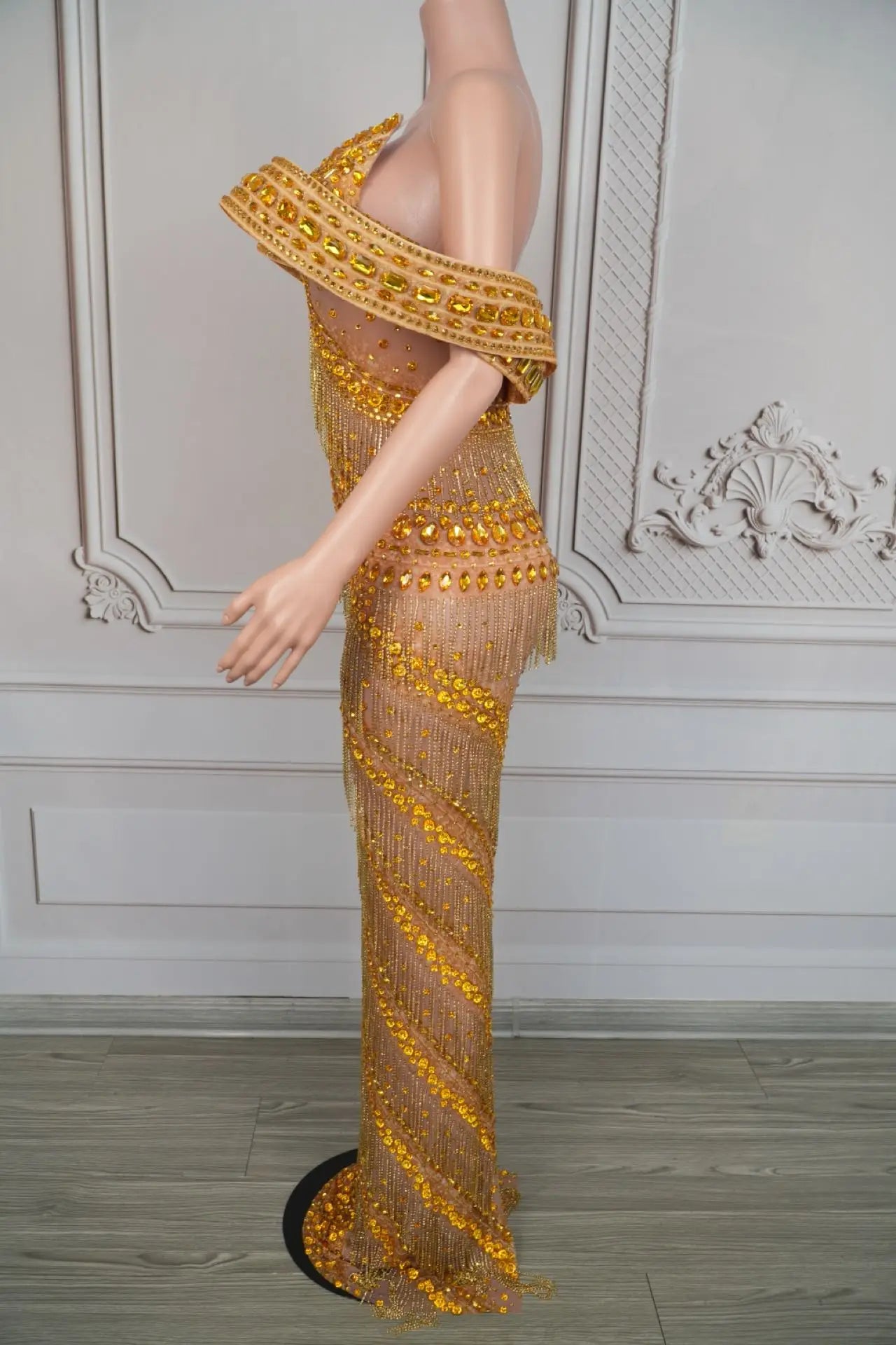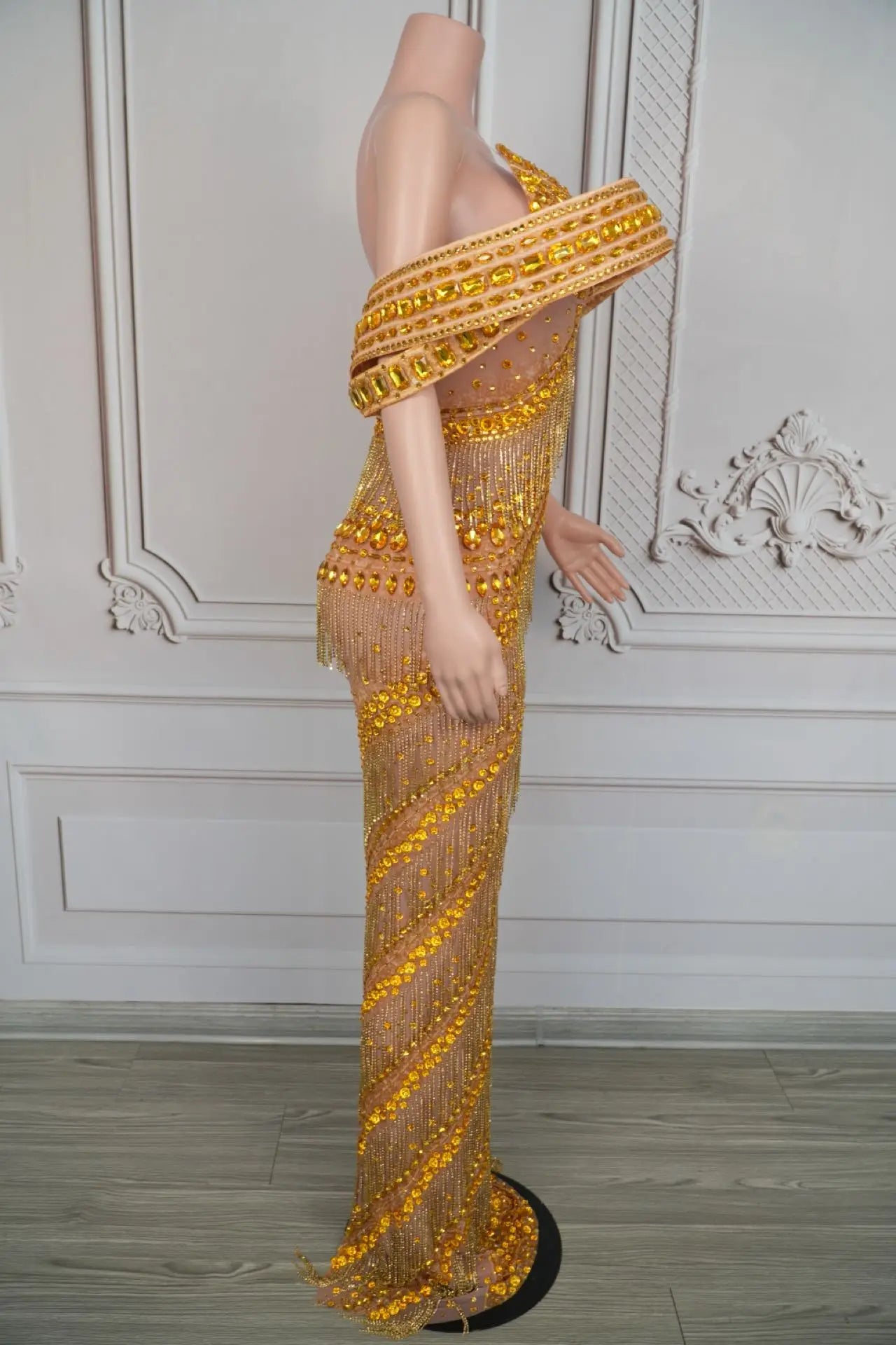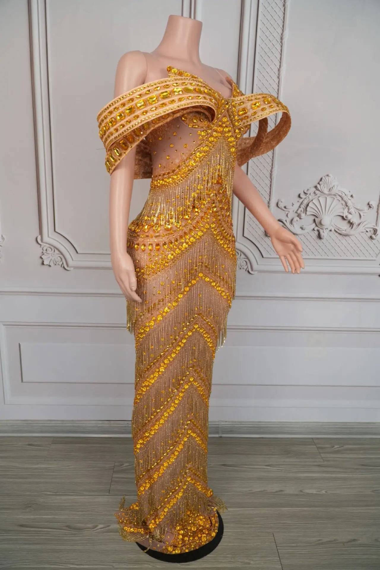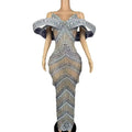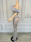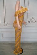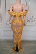 Sexy Glitter Rhinestone Gold Dress Party Off Shoulder Chain Long Dress Evening Gogo Clubwear Singer Stage Photoshoot Stage Wear