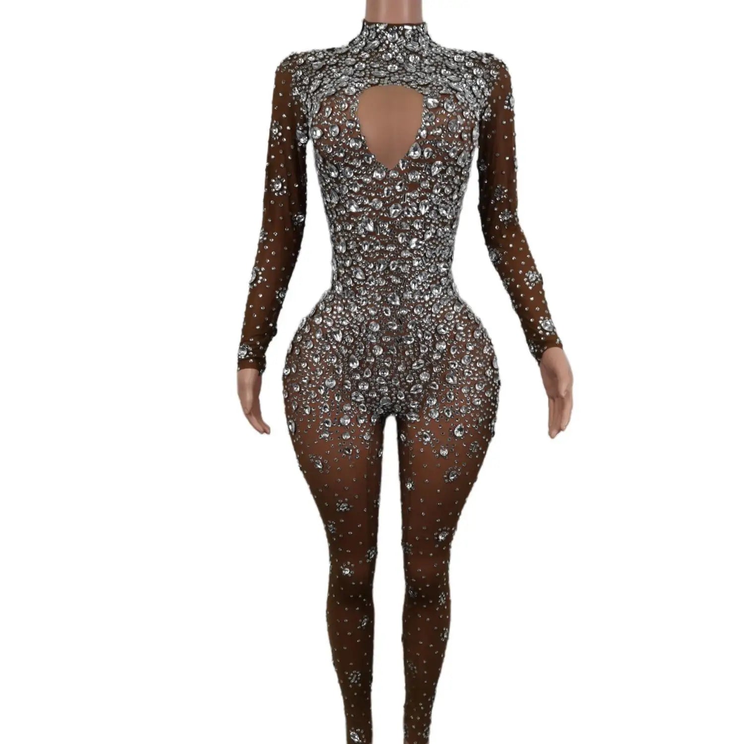 Sexy High-end Gorgeous Perspective Rhinestone Jumpsuit Long-sleeved Tights Nightclub Singer DJ Stage Performance Clothes Cuican