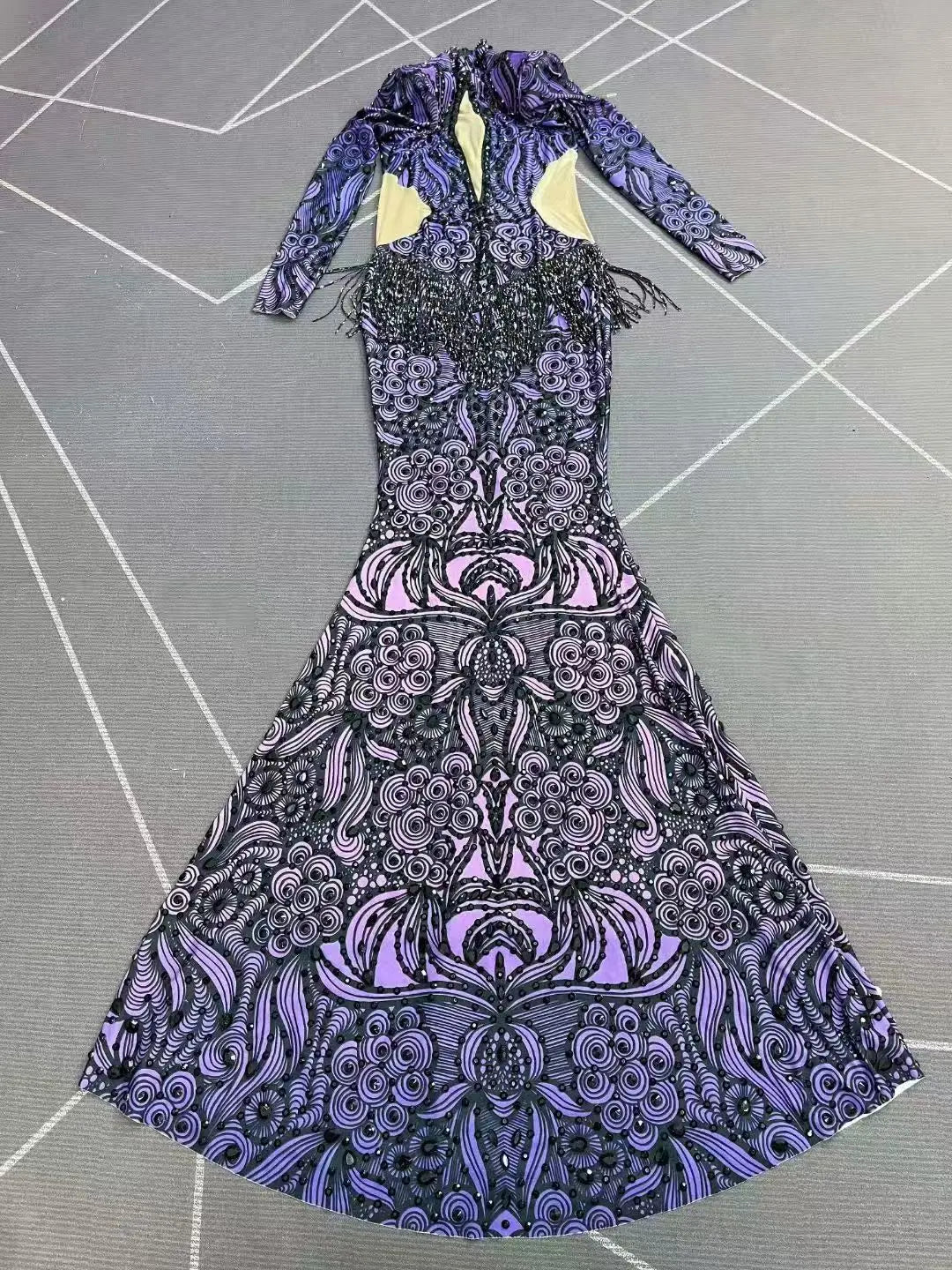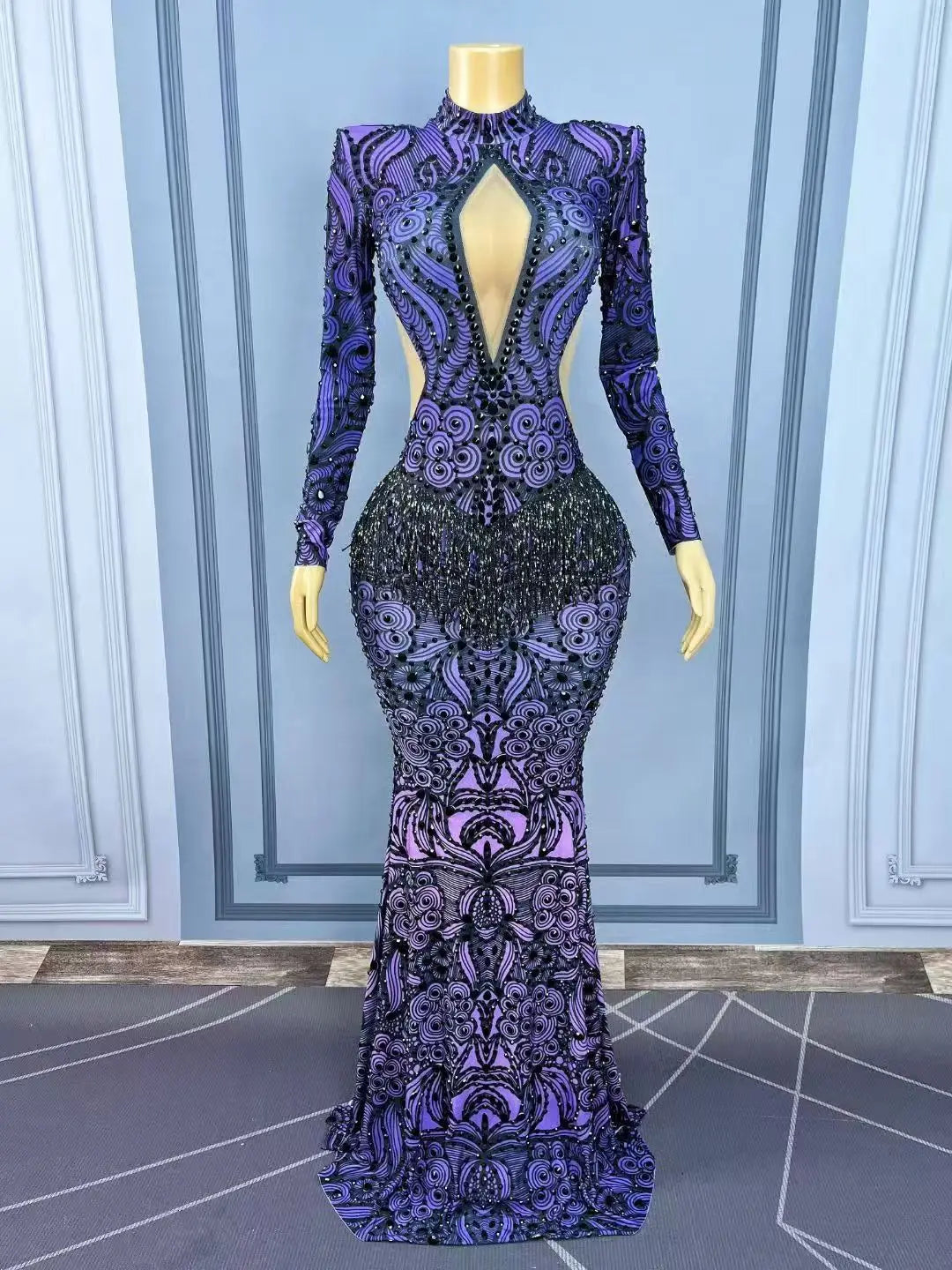 Turn every entrance into a performance with this Sexy High‑end Purple Shining Rhinestones Dress — a fitted, couture‑inspired gown trimmed with shimmering fringe and hand‑applied purple rhinestones. Designed for red‑carpet moments, fashion shows, photoshoots, and stage performances, this piece combines sultry tailoring with dynamic movement for maximum visual impact.