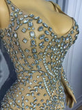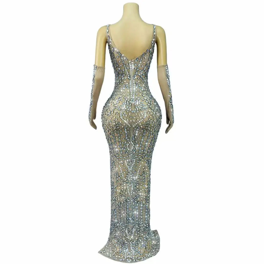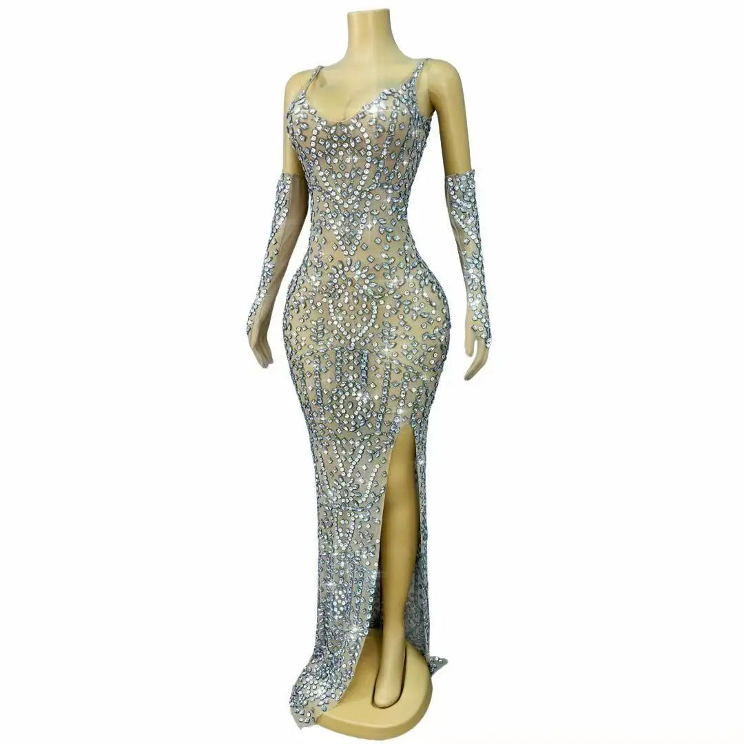 Sexy High-end Sparkly Rhinestones Elegant High Split Suspenders Dress Gloves Outfit Birthday Evening Party Gowns Stage Wear