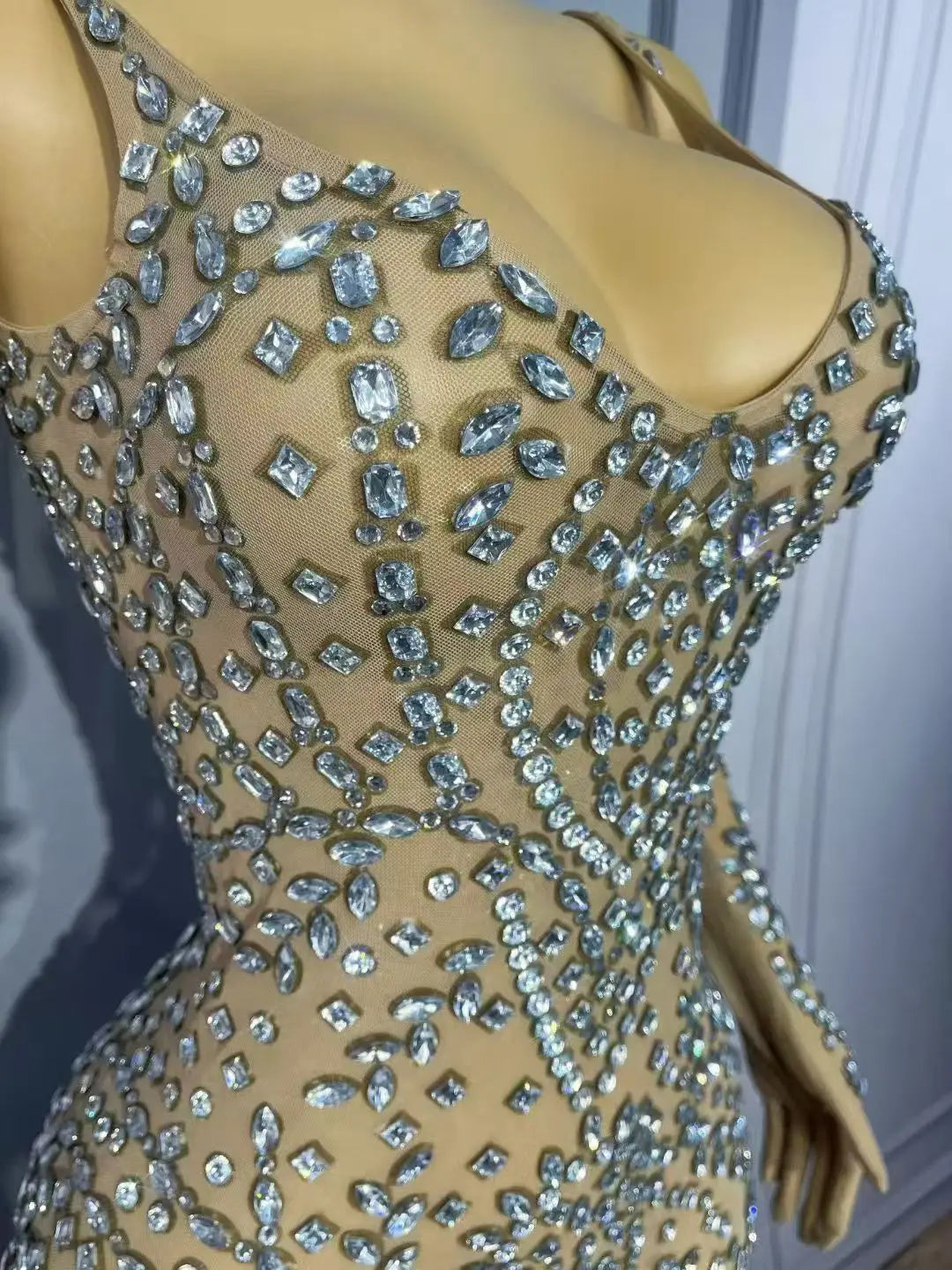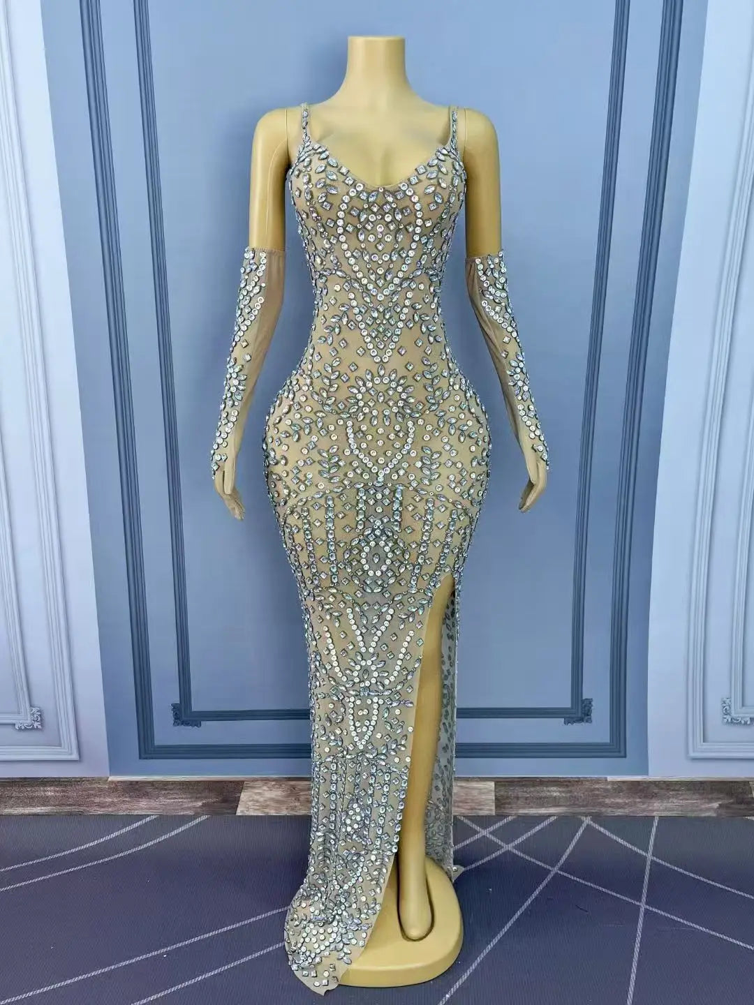 Make a bold, unforgettable entrance in this Sexy High‑end Sparkly Rhinestones Ensemble — an elegant suspenders dress with a dramatic high slit paired with matching embellished gloves. Designed for birthdays, evening parties, red‑carpet moments, and stage performances, this outfit blends couture sparkle with wearable construction so you look flawless under lights and on camera.