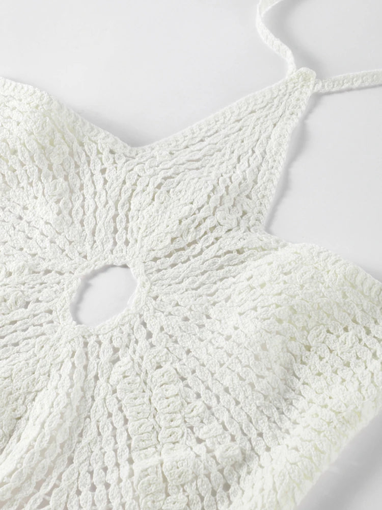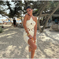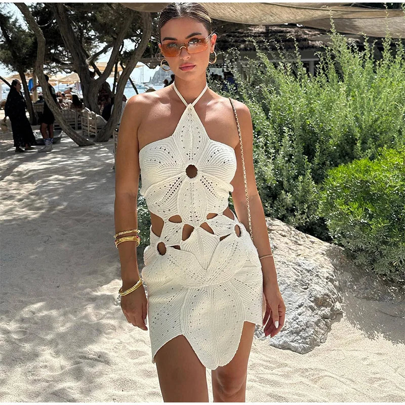 Turn up the heat this summer with this sexy hook knit beach mini dress for women. Featuring a stylish hollow-out design, halter neckline, and lace-up back, this sleeveless and backless dress offers a chic, slim fit perfect for the beach or any sunny getaway. Embrace effortless elegance and confidence with this trendy summer dress for ladies.