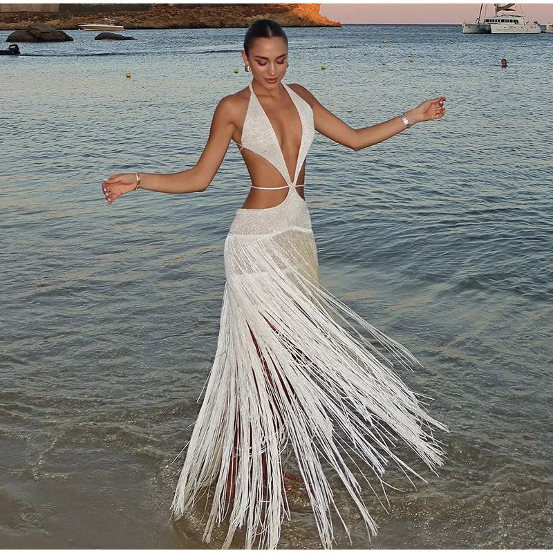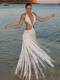Turn up the heat on your next getaway with this sexy knit tassels halter dress. Featuring a daring hollow-out design, backless lace-up detail, and a slim, sleeveless fit, this long dress blends boho vibes with sultry elegance. The tassel accents add playful movement, making it perfect for summer holidays, beach parties, or resort lounging. Stay chic and confident all season long in this standout beach robe.