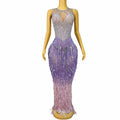 A bold, celebratory showpiece made for birthdays, photoshoots, club sets, and stage performances — this Sexy Luxurious Rhinestones Fringes Dress fuses high‑glam rhinestone coverage with playful fringe and tassel movement in vibrant purple and pink tones. The sleeveless slip silhouette keeps the look modern and performance‑ready while sequins and tassels provide kinetic sparkle in every turn.