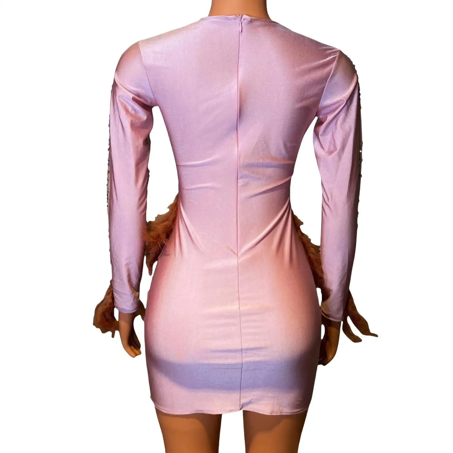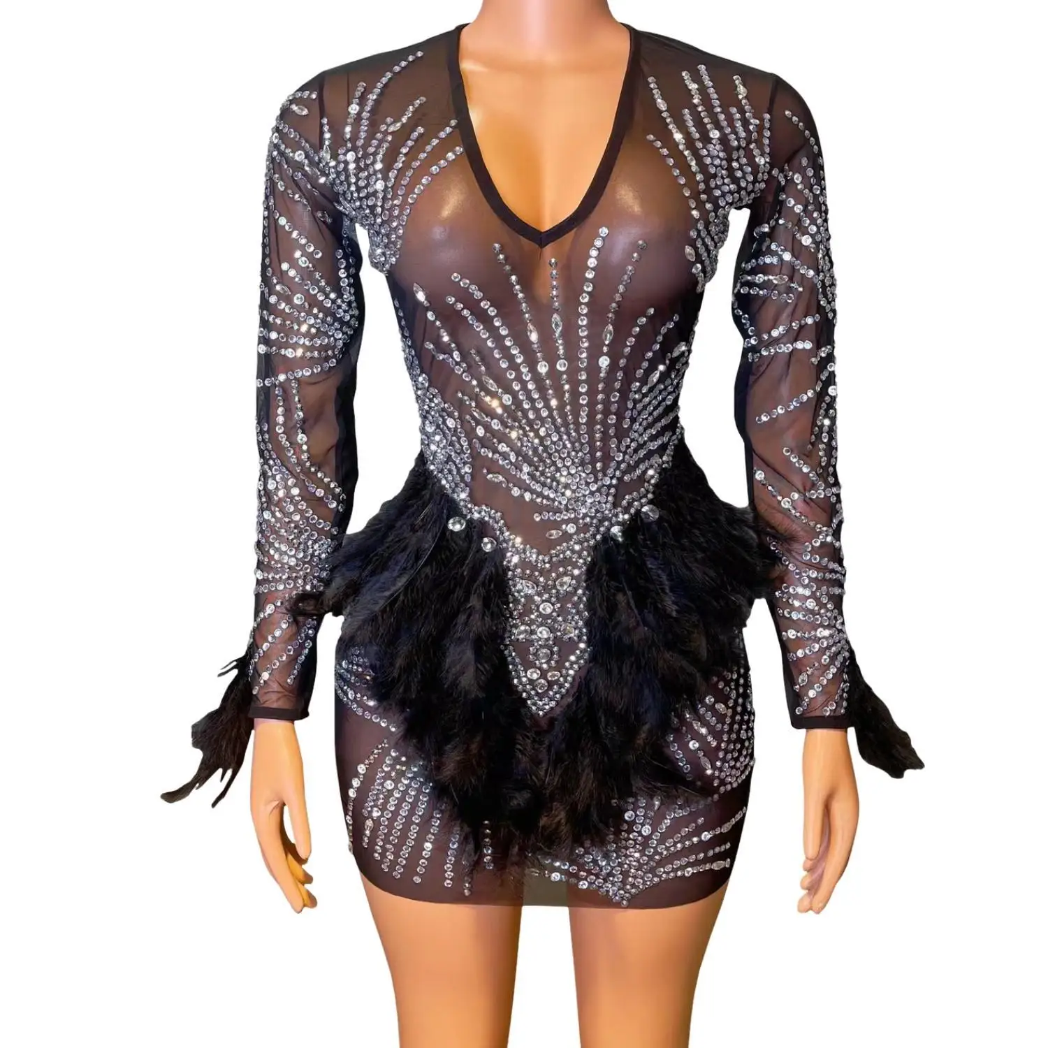 Sexy See Through Women Birthday Party Formal Gown Sheer Luxury Rhinestones Feather Dress Black Girls Short Prom Dress Huolieniao