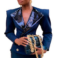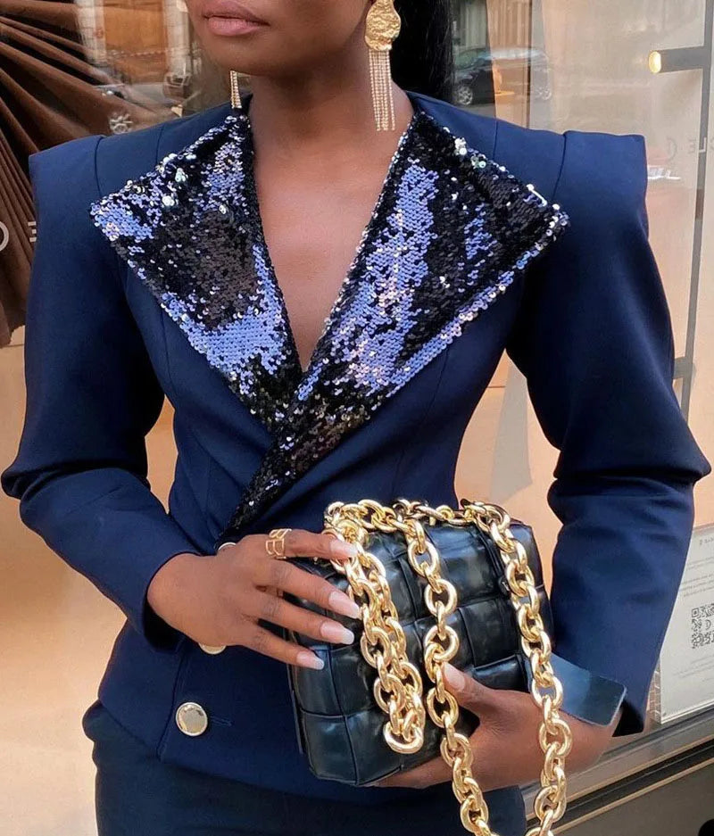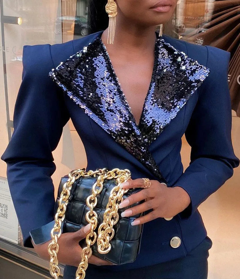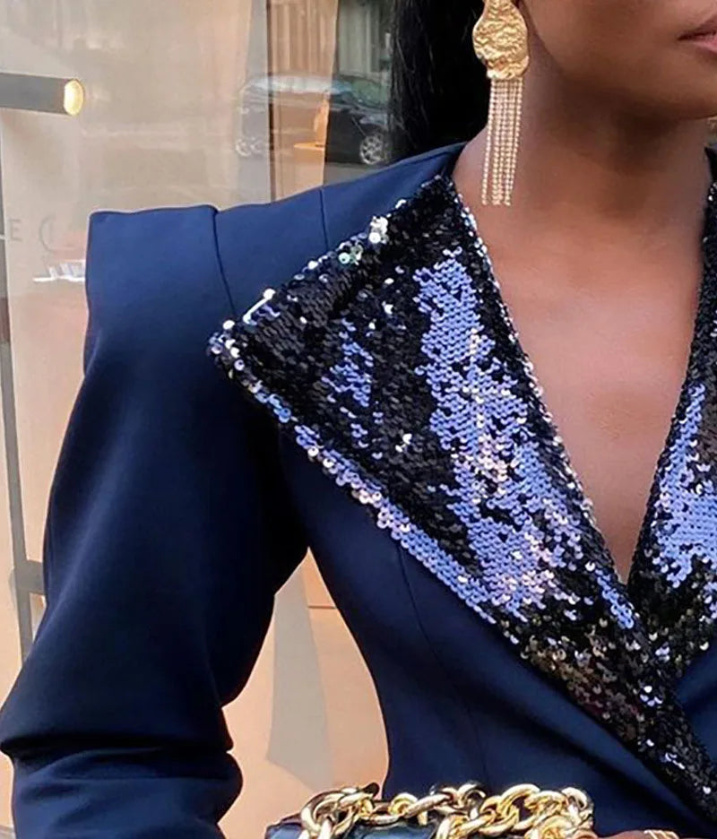 Make a statement with this sexy sequined mother of the bride dress, featuring a vintage slim-fit black jacket for a custom-made and cohesive look. Perfect for proms, casual gatherings, and formal occasions, this 1-piece set exudes sophistication and elegance. The sequined detailing adds a touch of glamour and sparkle, while the slim-fit jacket offers a modern and tailored silhouette. Step into the spotlight with confidence and style in this versatile and chic ensemble that is sure to make you stand out at any event. Whether you're attending a formal affair or a casual gathering, this outfit exudes timeless elegance and charm.