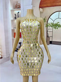 Turn every outing into a headline moment with this Sexy Shiny Gold Mirrors Trim Fit Suspenders Dress — a bold, high-glamour piece that blends everyday wearability with stage-ready sparkle. Designed for birthday girls, performers, club-goers, and anyone who wants to make an unforgettable entrance, this dress pairs sculpting fit with dazzling mirror-like trim for maximum visual impact.