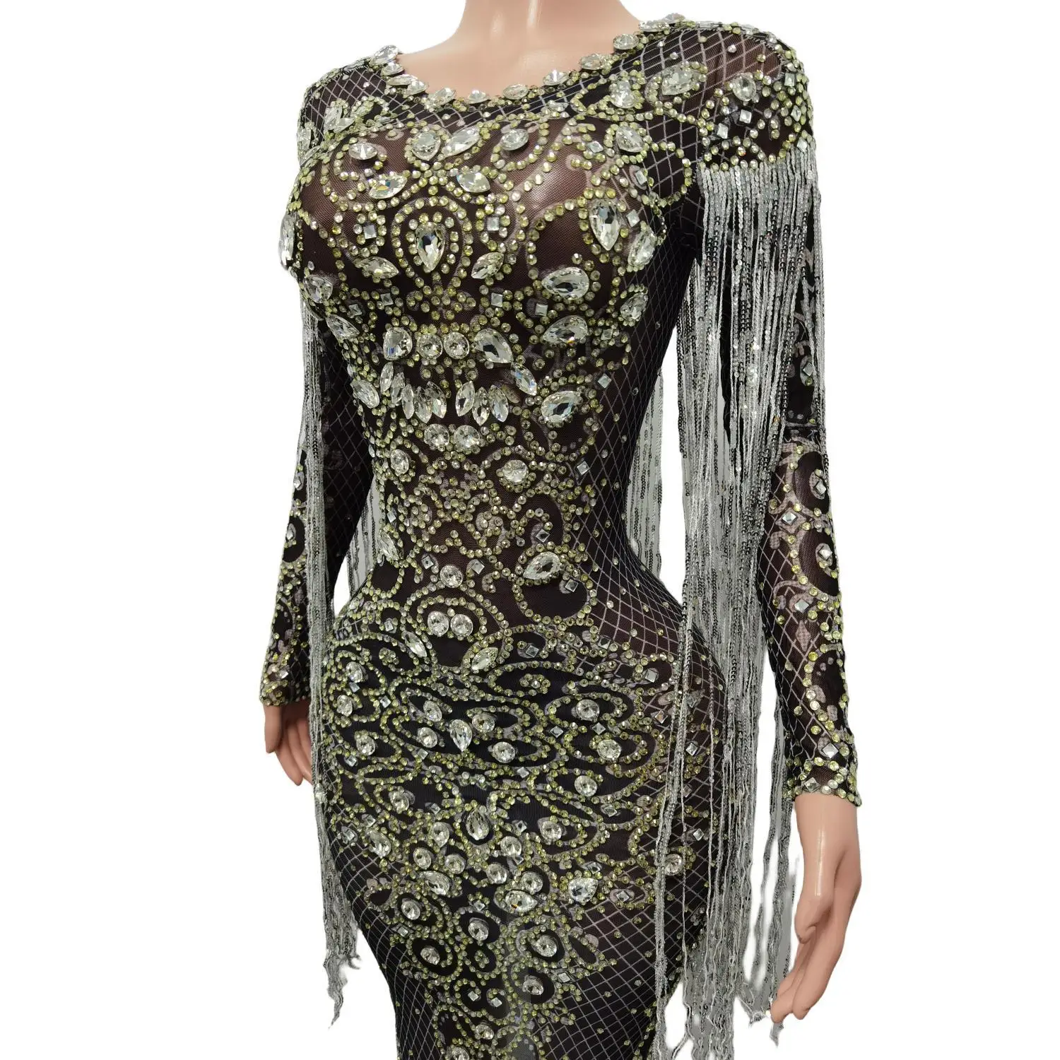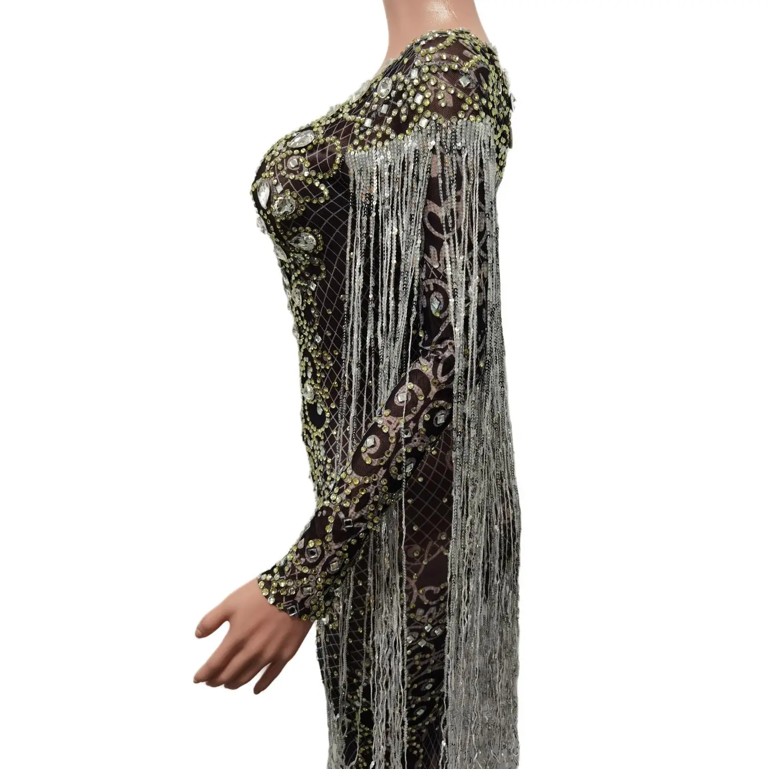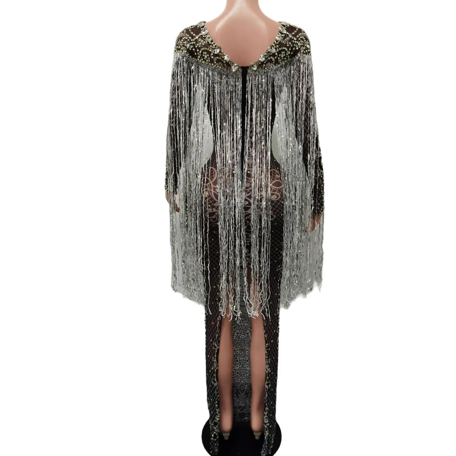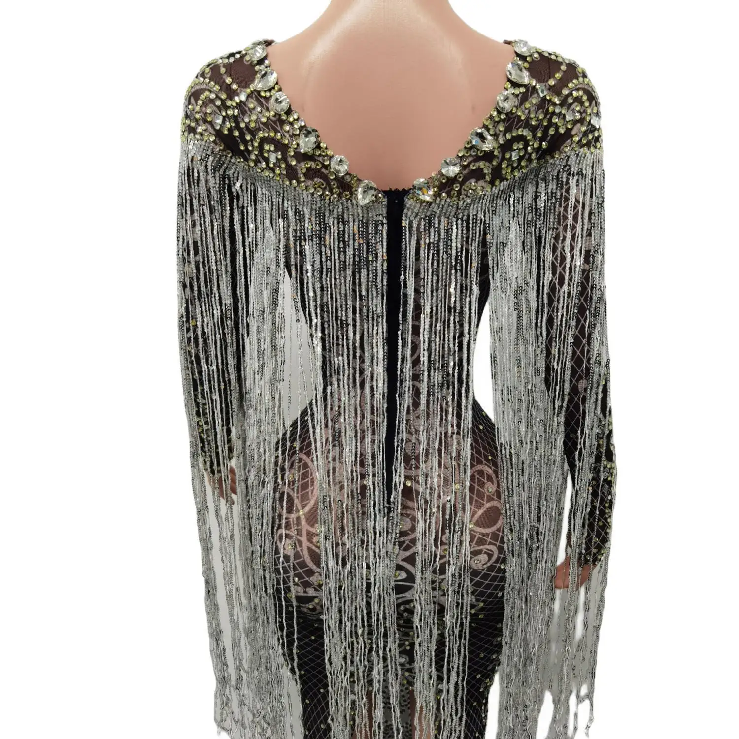 Sexy Silver Sequin Fringes Transparent Mesh Dress Women Evening Birthday Celebrate Outfit Sexy Performance Costume Shuiliandong