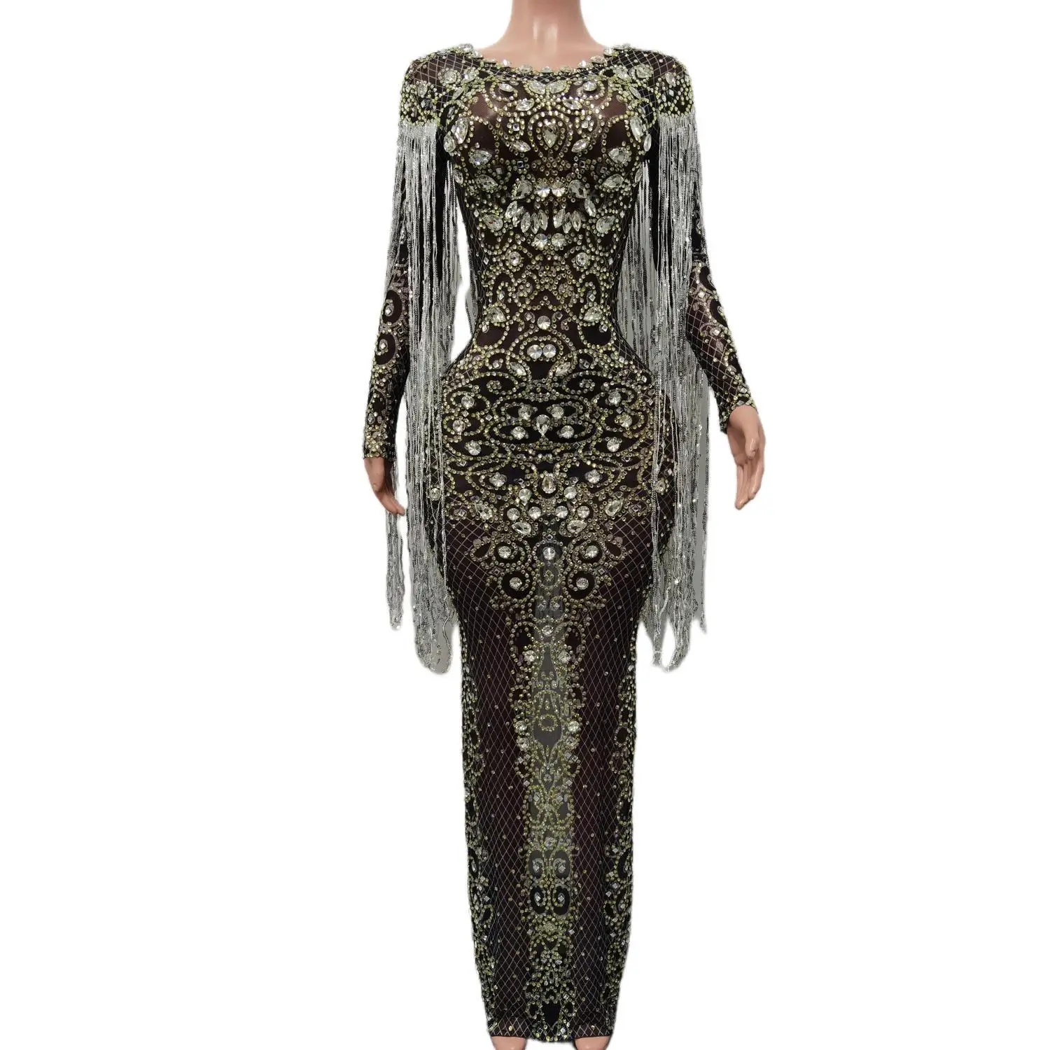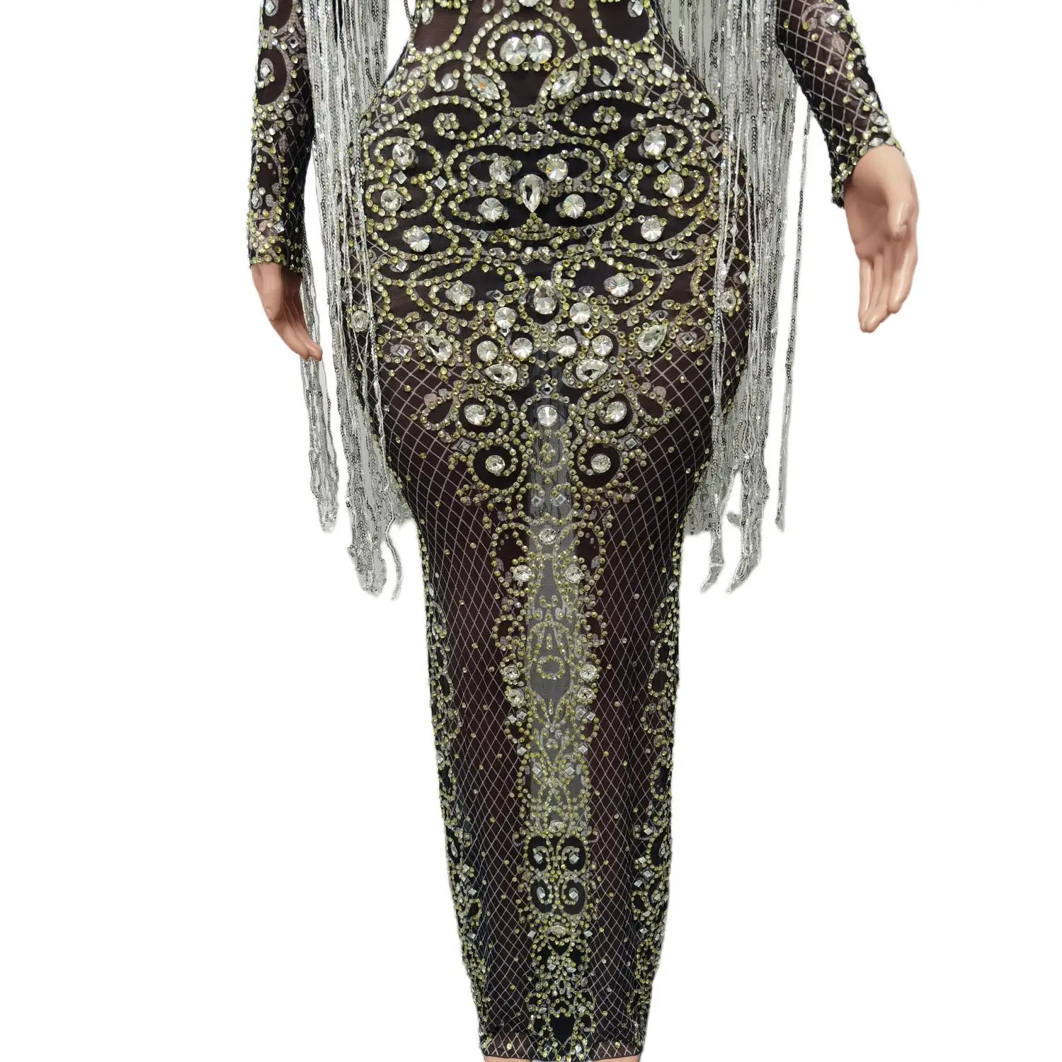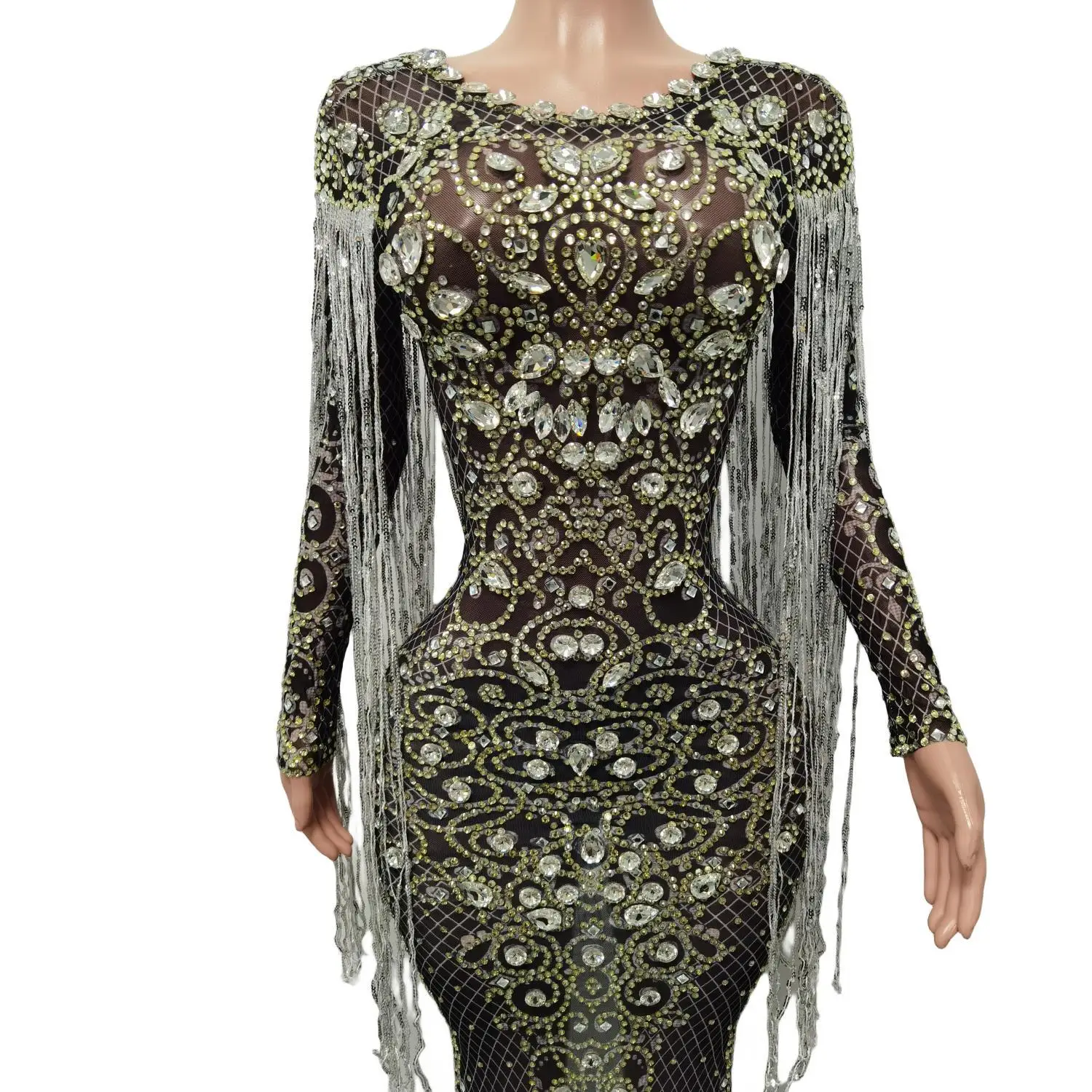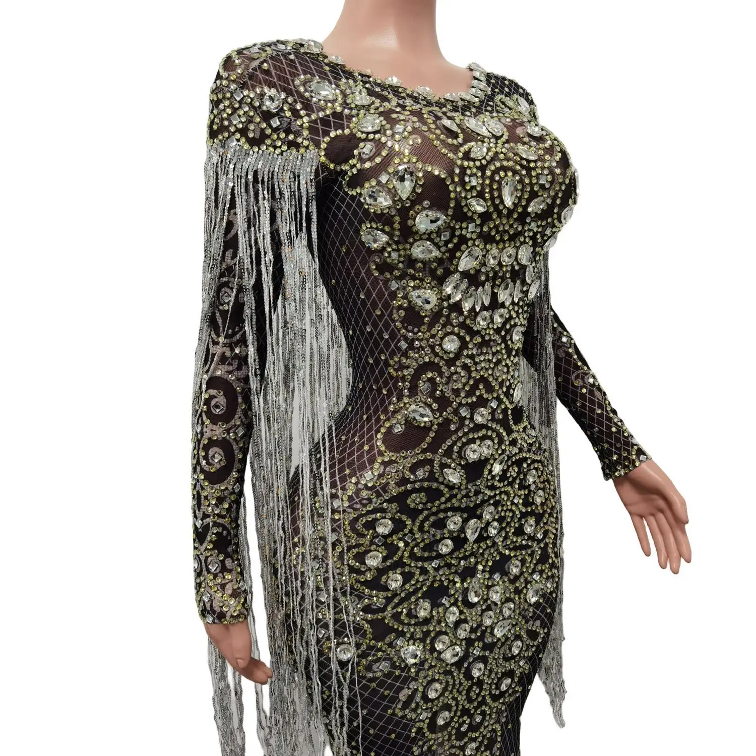 Sexy Silver Sequin Fringes Transparent Mesh Dress Women Evening Birthday Celebrate Outfit Sexy Performance Costume Shuiliandong