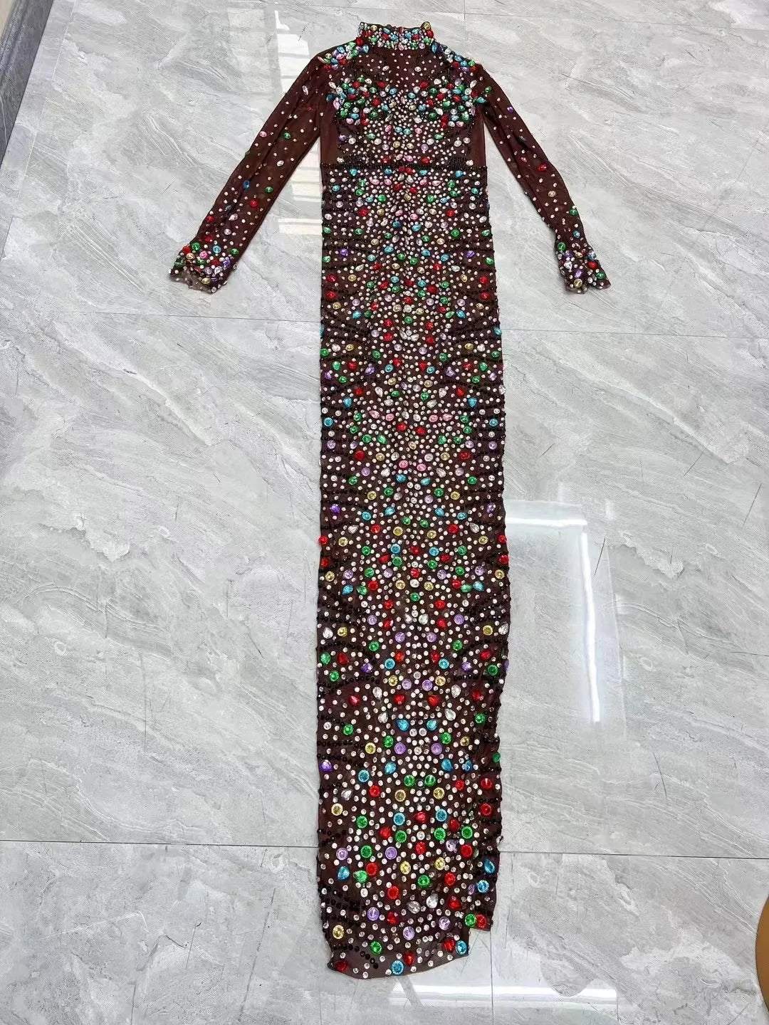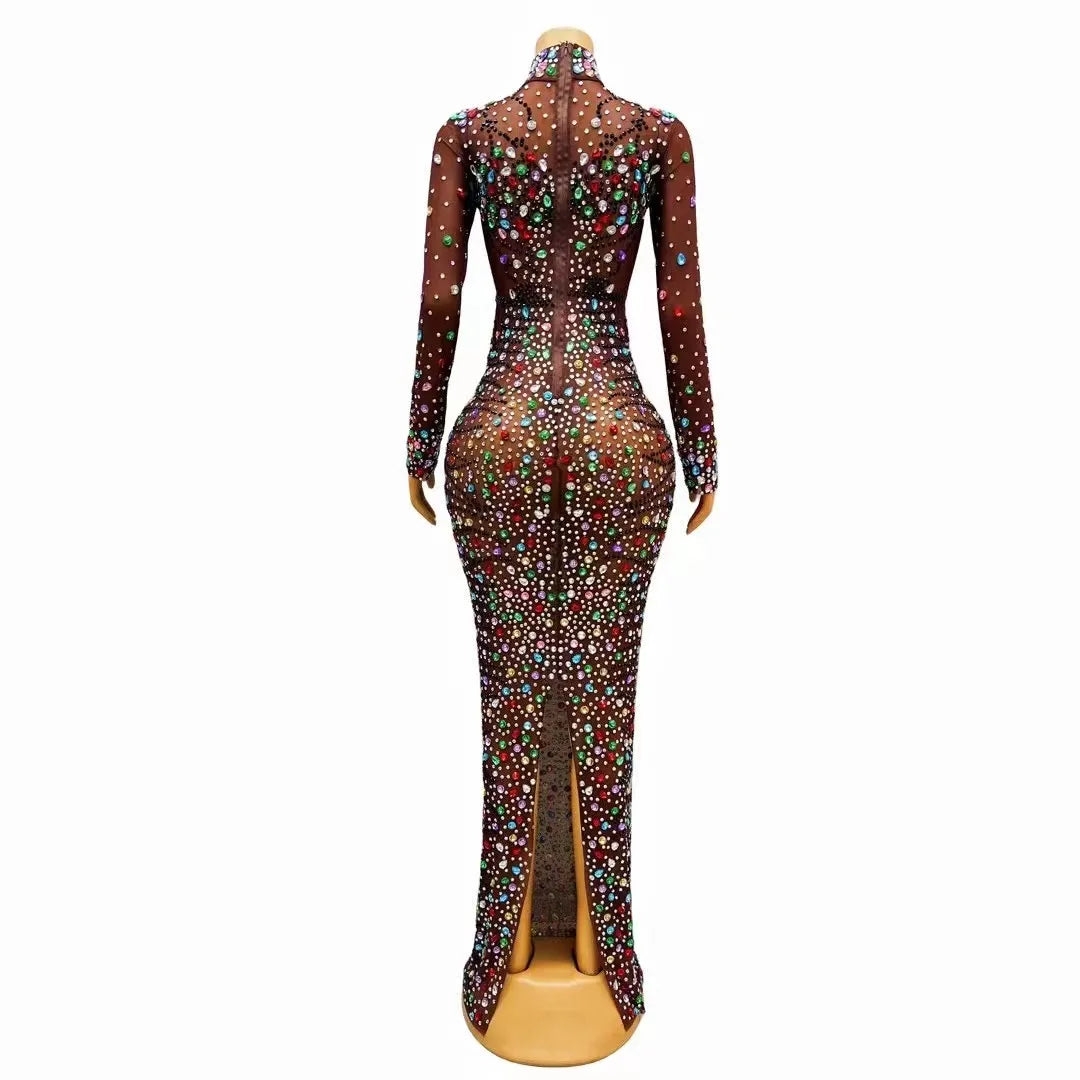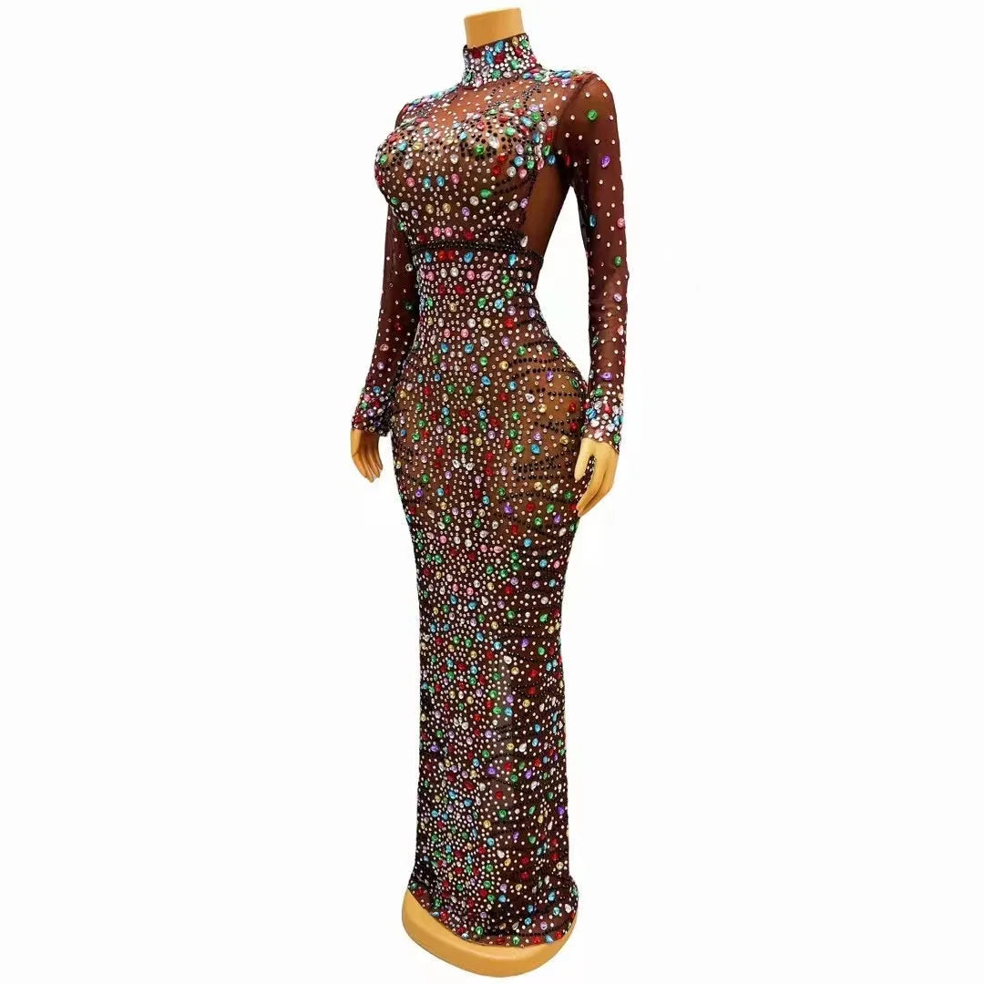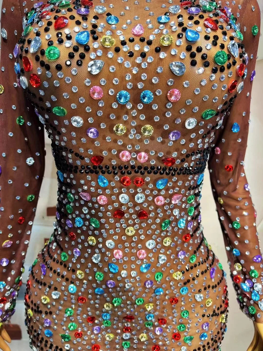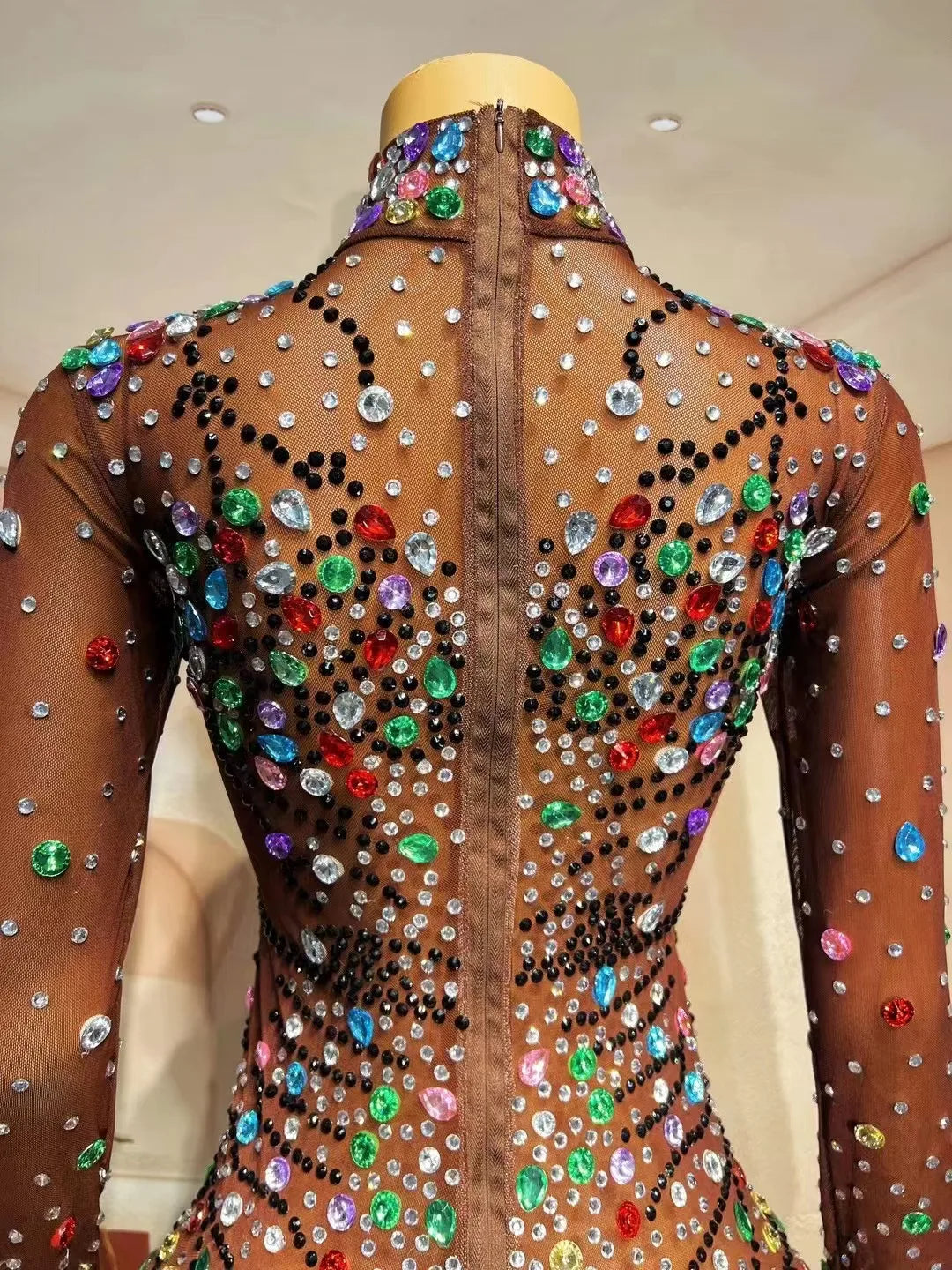 - Sparkle in depth and color with this Sexy Sparkly Colorful Rhinestones Long‑Sleeves Dress. Crafted from sheer brown stretch mesh with a soft inner lining, the dress features dense, hand‑applied multicolor rhinestones across the bodice, sleeves, and hips to create a prismatic effect under lights. The long sleeves and contoured cut provide a sleek, elegant silhouette that’s perfect for evening events, stage performances, and editorial photoshoots. Reinforced seams, secure embellishment stitching, and a hidden zipper ensure comfort and durability during wear.
