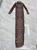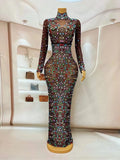 Sexy Sparkly Colorful Rhinestones Long Sleeves Dress Luxurious Evening Brown Mesh Costume Party Celebrate Photo Shoot Dress