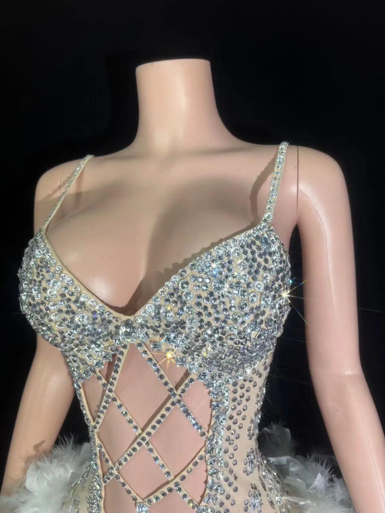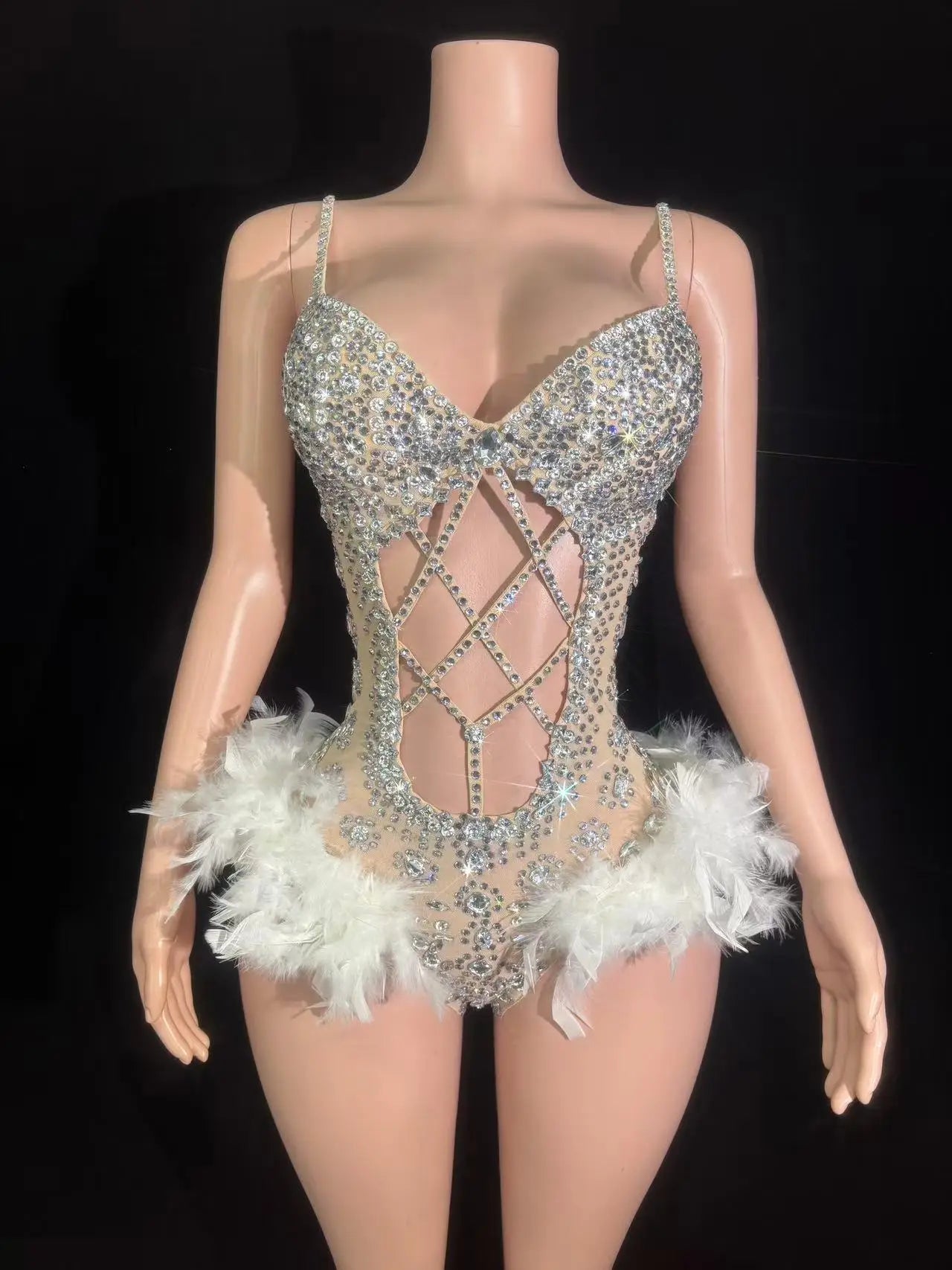 Turn every entrance into a showstopper with this Sexy Sparkly Rhinestones Feathers Bodysuit — a dazzling performance piece designed for singers, dancers, and party-goers who demand drama, movement, and high-glamour. Combining radiant rhinestone embellishment with luxurious feather accents and a daring hollow-slip silhouette, this bodysuit captures attention from the first step onto the stage to the final pose in the photoshoot.