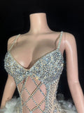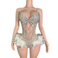 Sexy Sparkly Rhinestones Feathers Bodysuit Women Hollow Slip Performance Dance Costume Singer Dancer Stage Wear Party Outfit