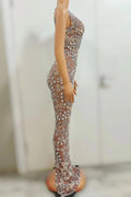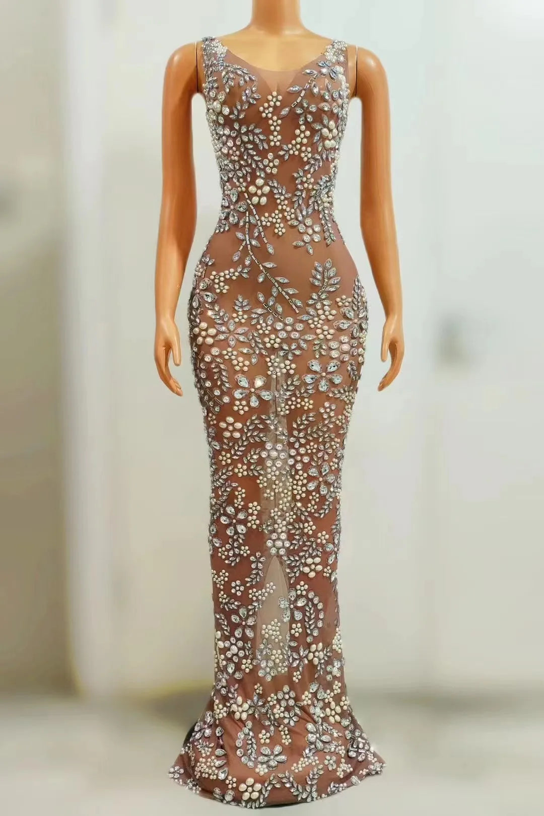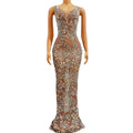 Turn every moment into a spotlight moment with this ultra-glamorous mesh long dress, expertly designed for women who want daring, camera-ready style. Crafted from sheer, premium mesh and lavishly embellished with sparkling rhinestones, the gown creates a luminous, see-through effect that flatters and teases without sacrificing elegance. Rhinestones are strategically placed to highlight the bust, waist, and hip lines, producing a sculpted silhouette that catches and reflects light for dramatic stage and photographic impact.