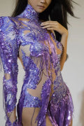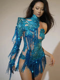 Sexy Sparkly Rhinestones Sequins Single Sleeve Bodysuit Singer Dancer Stage Wear Performance Dance Costume Party Birthday Outfit