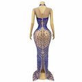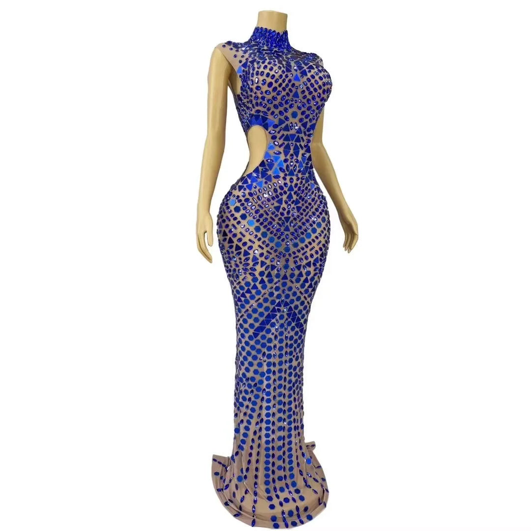 Sexy Stage High Grade Blue Sparkly Rhinestones Mirrors Hollow Waist Mesh Dress Evening Prom Elegant Costume Red Carpet Gowns
