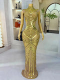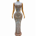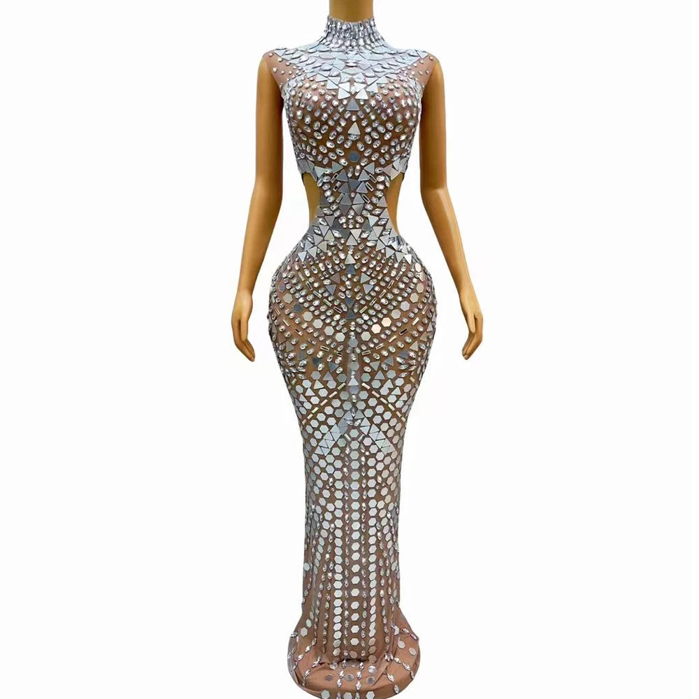 Sexy Stage High Grade Blue Sparkly Rhinestones Mirrors Hollow Waist Mesh Dress Evening Prom Elegant Costume Red Carpet Gowns