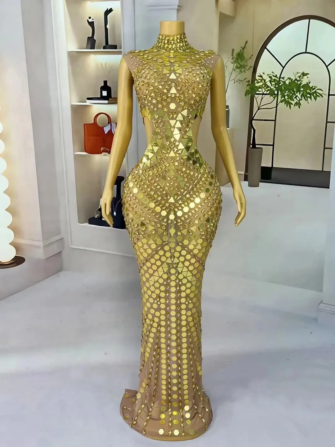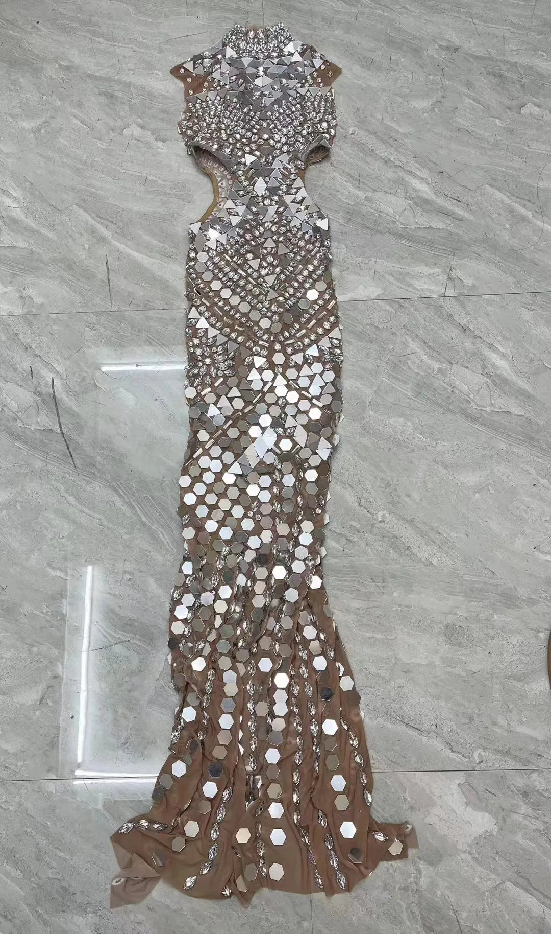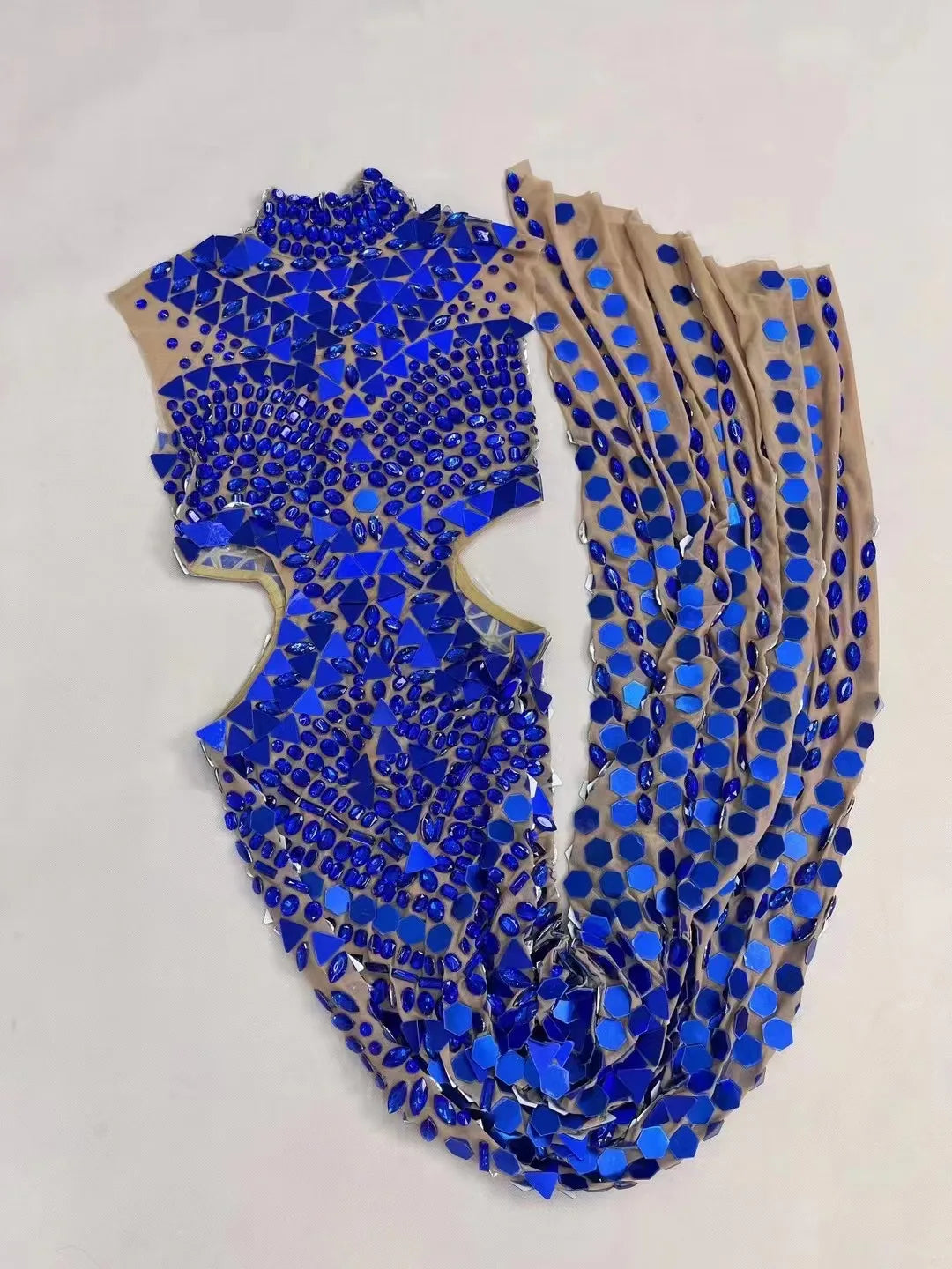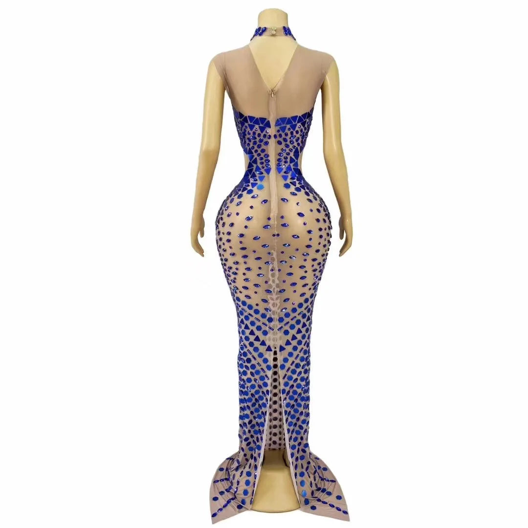Make a breathtaking entrance with this high-grade blue mesh dress, designed to catch every light and lens with precision. Combining luxe materials, expert tailoring, and couture-level embellishment, this gown is a statement piece for red carpets, stage performances, proms, and evening events where glamour is mandatory.