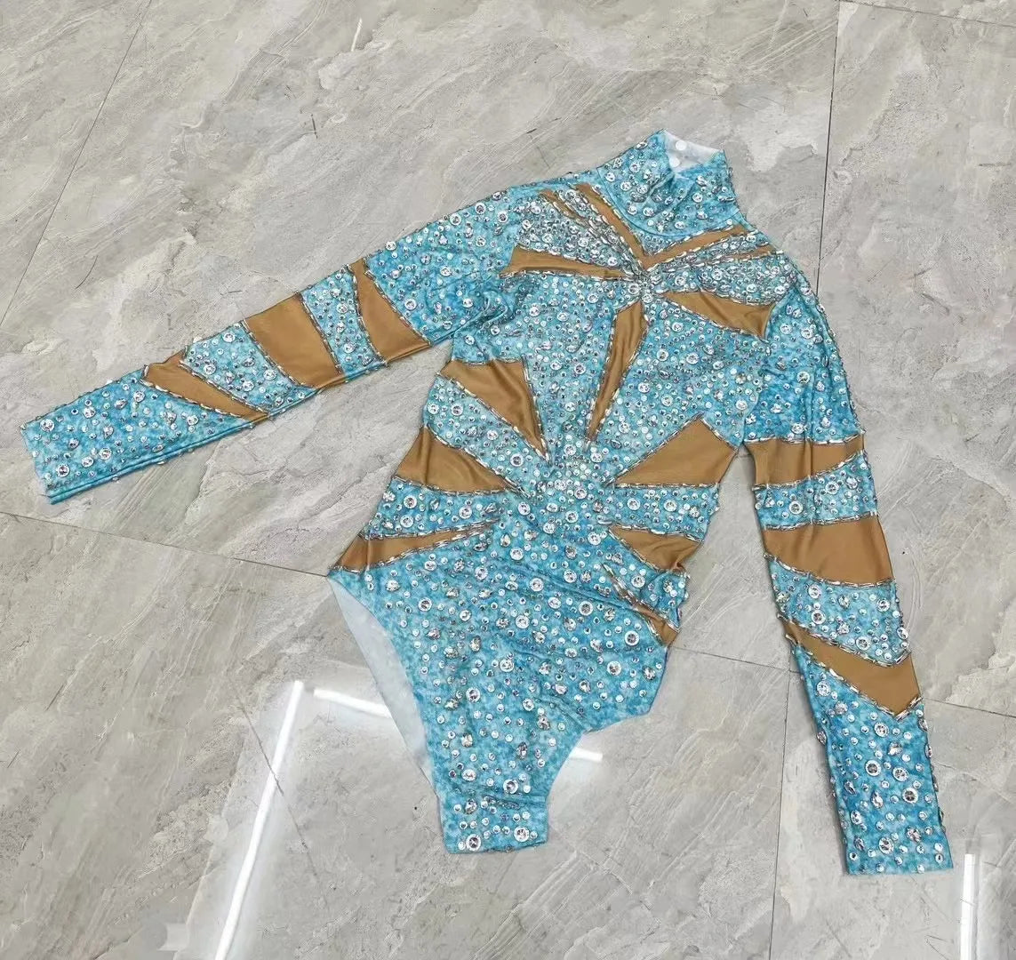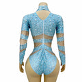 Sexy Stage Sky Blue Spandex Leotard Silver Rhinestones Luxury Celebrate Bodysuit Outfit Party Singer Collection Birthday Costume