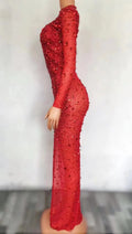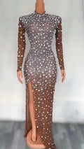 Turn every entrance into a show-stopping moment with this Sexy Stage Sparkly Silver Rhinestones Transparent Evening Long Dress — a breathtaking fusion of sultry transparency, high-glamour sparkle, and performance-ready design. Crafted for dancers, performers, birthday celebrants, prom-goers, and anyone who wants to command attention on the dancefloor or runway, this long dress balances revealing elegance with structural details that flatter and support.