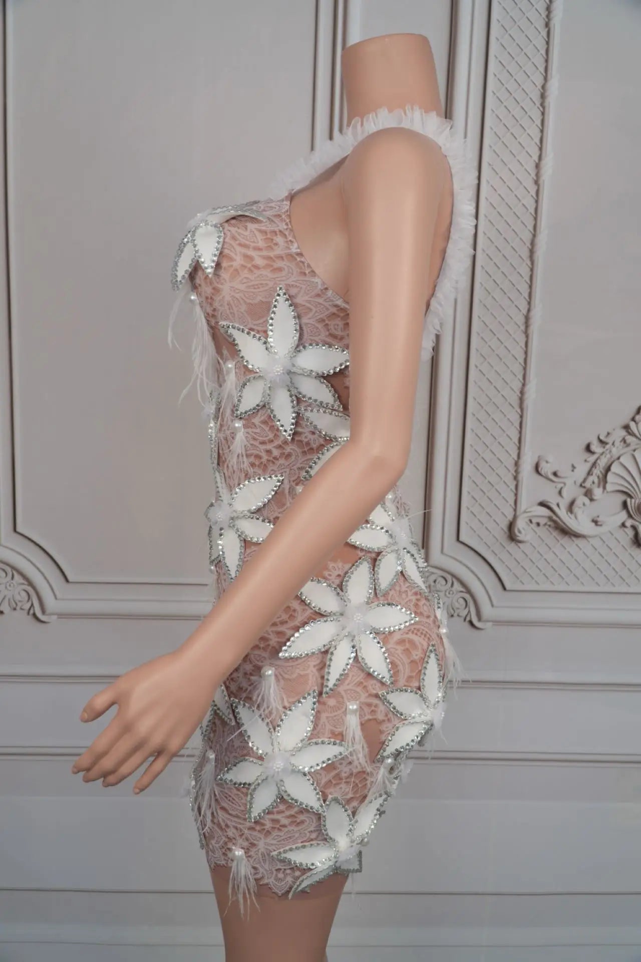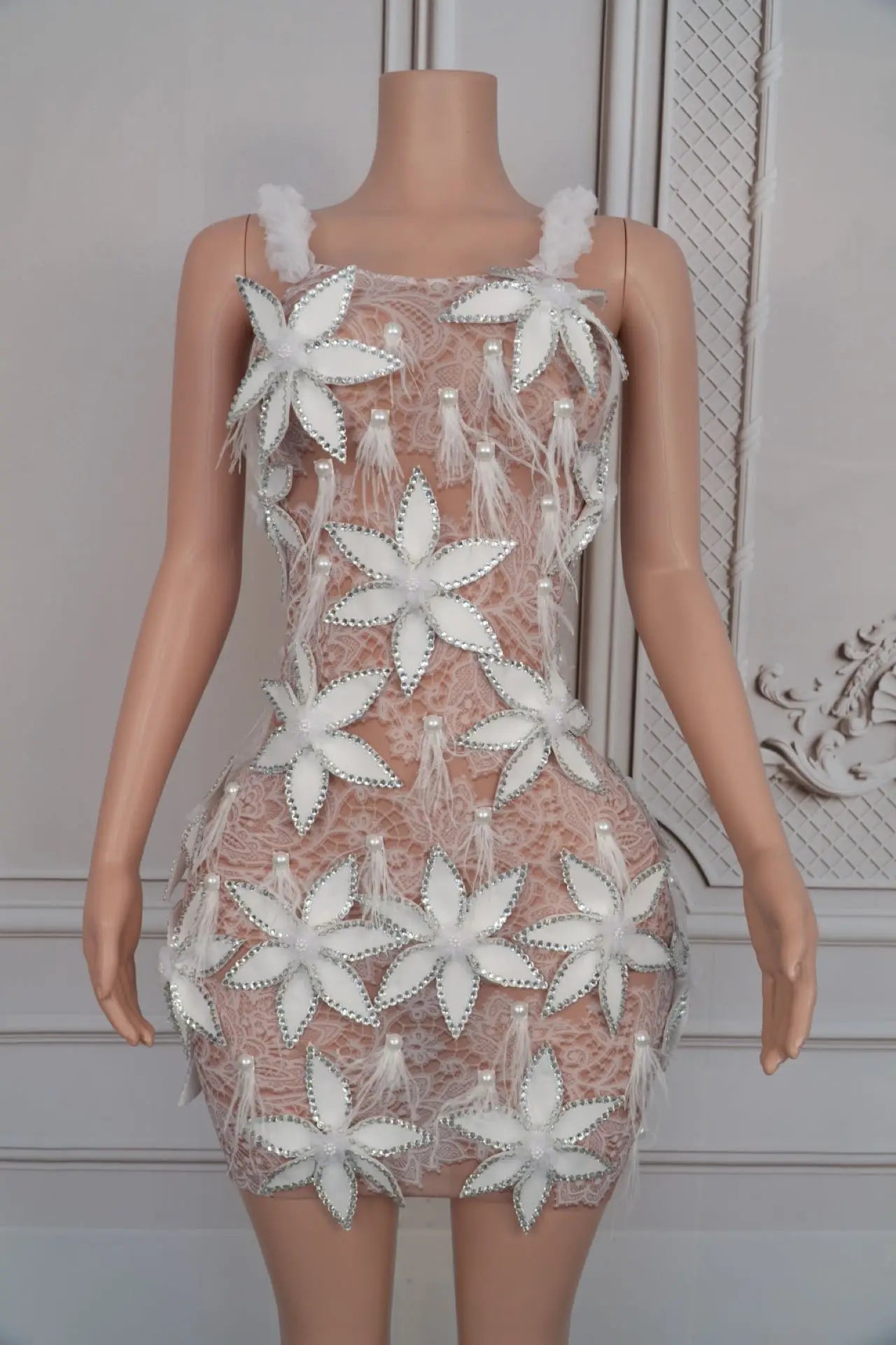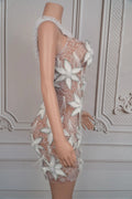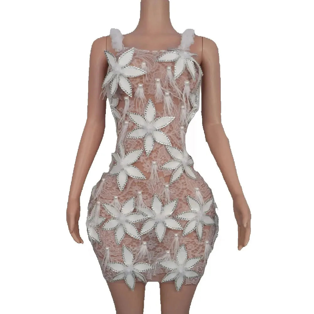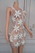 Sexy Stage Straps See Through Mesh Slip Short Dress Flowers Details Sleeveless Backless Mini Bodycon Cocktail Party Club Wear