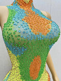 Sexy Stage Yellow Green Rhinestones Sleeveless Dress Woman Dance Outfit Birthday Party Club Dance Photoshoot Costume