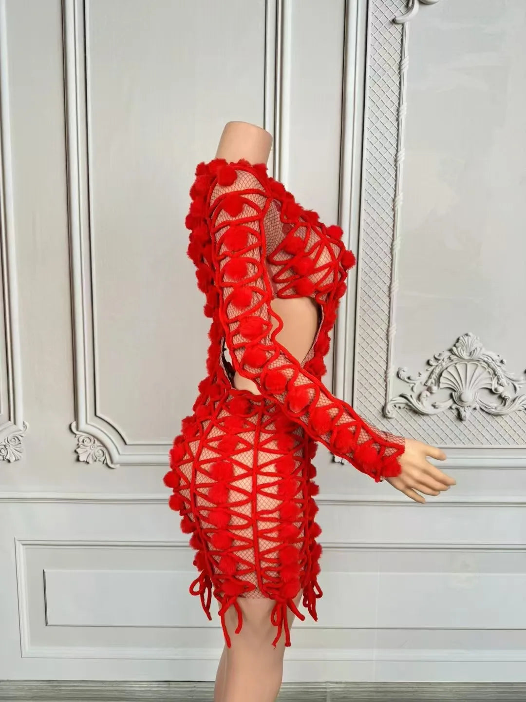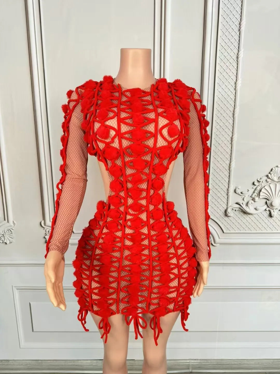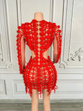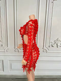Sexy Women's Red Hollow Out Mini Dress Elegant Full Sleeves Birthday Wedding Dress New Party Club Photoshoot Dress