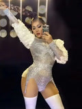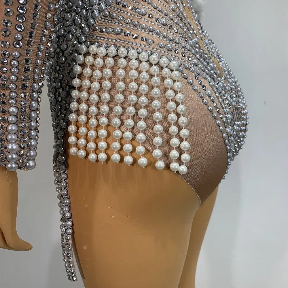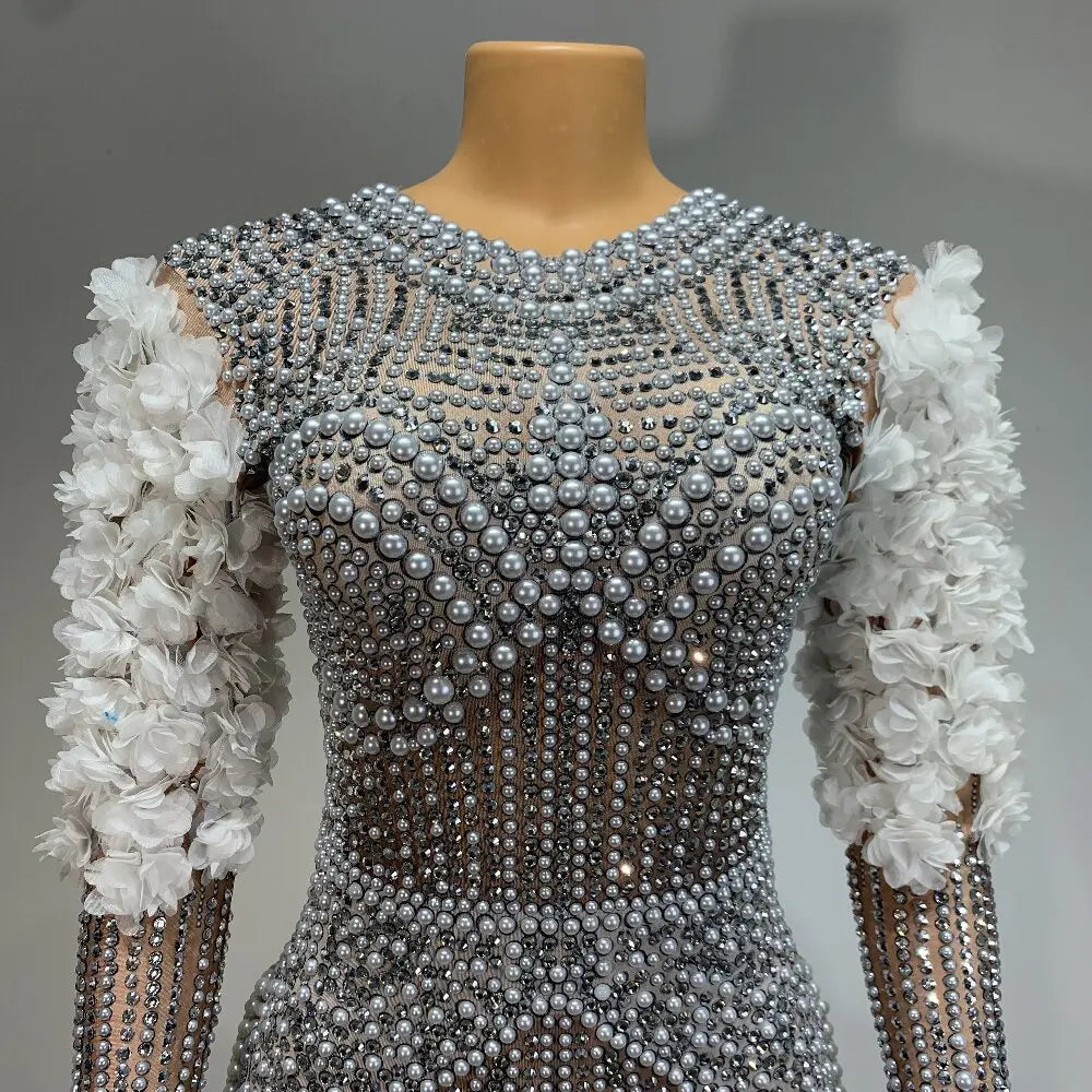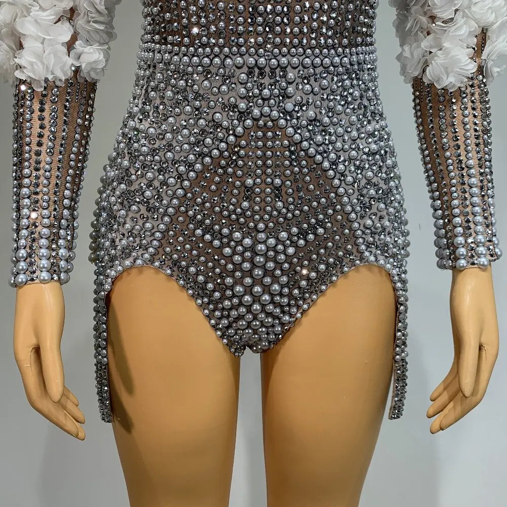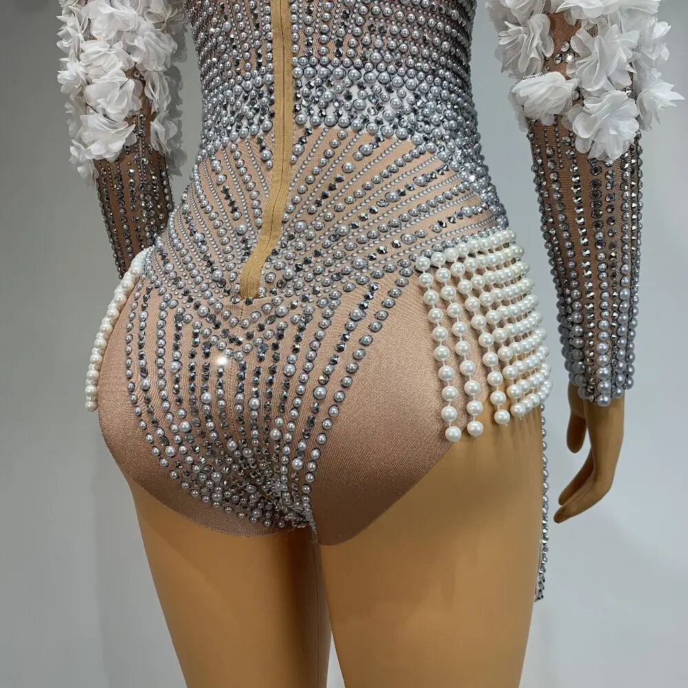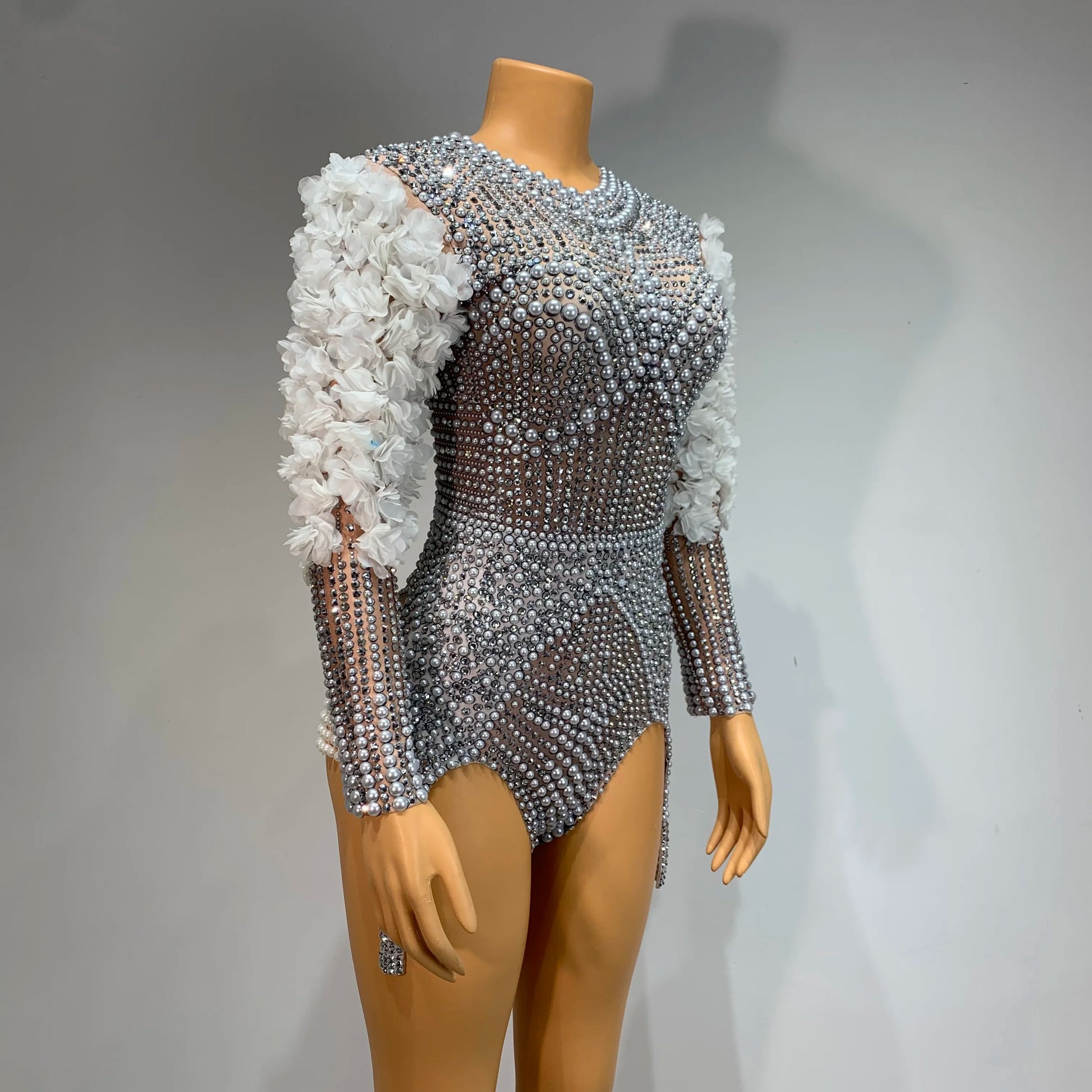 Shining Luxury Tight Bodysuit Women Sexy Pearls Rhinestone Flowers Stage Outfit Performance Dance Costume Nightclub Wear
