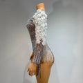 Command the stage and steal every spotlight in this shining luxury tight bodysuit, designed for women who want an exquisite blend of glamour, sensuality, and performance-ready construction. The figure-hugging silhouette sculpts and supports the body, creating a sleek, elongated line that flatters curves while allowing freedom of movement for dancers and performers. Luxurious pearl accents, sparkling rhinestones, and delicate floral appliqués are artfully arranged across the bodysuit to create a high-end, couture-inspired look that glitters under stage lights and in nightclub settings.