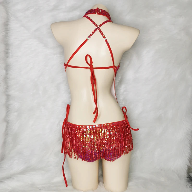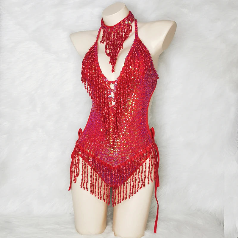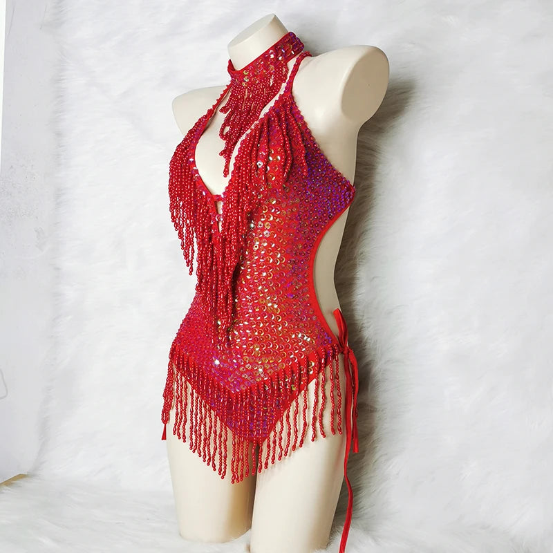 Turn heads with this shiny one-piece bodysuit for women, featuring striking red beading, sparkling sequins, and playful tassel accents. Perfect as sexy clubwear or a bold party outfit, this glamorous costume is ideal for stage performances and dance events where you want to shine and stand out.