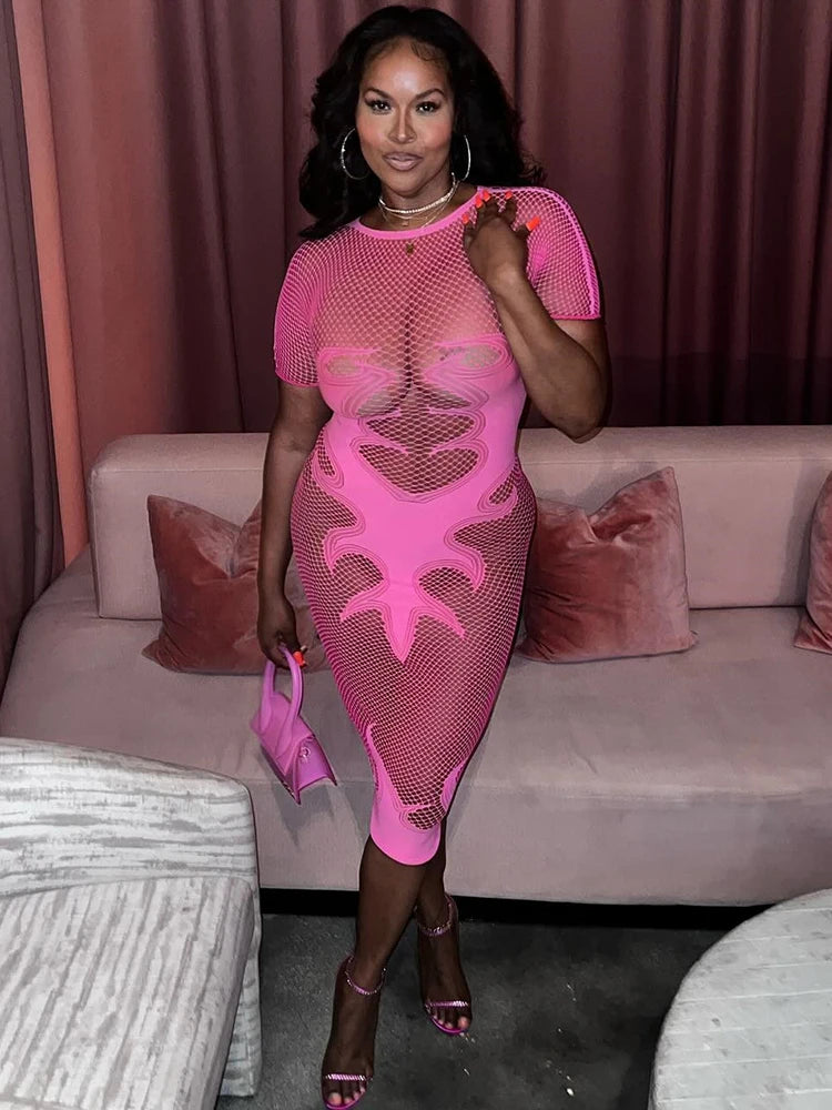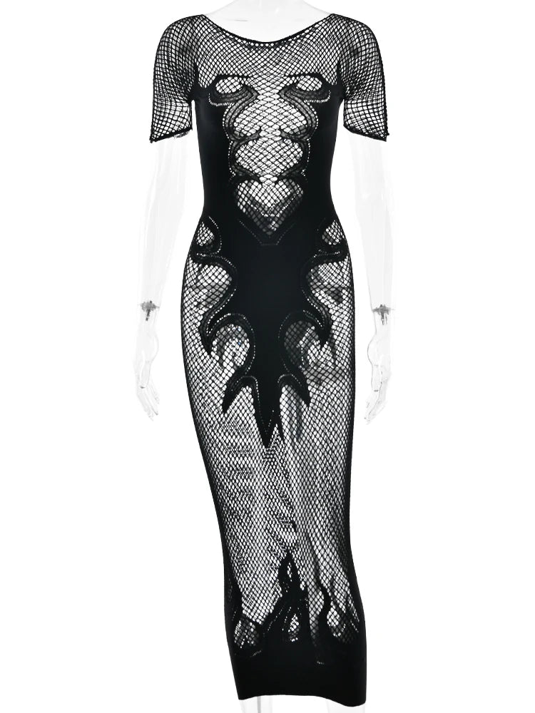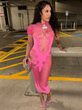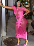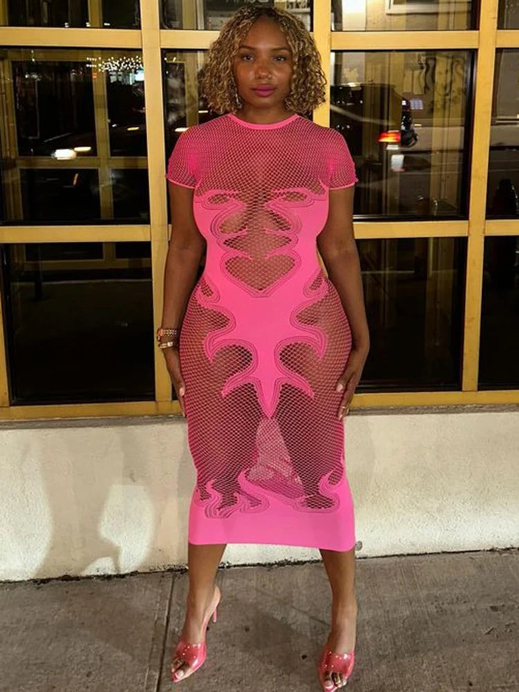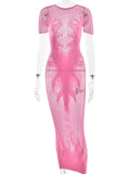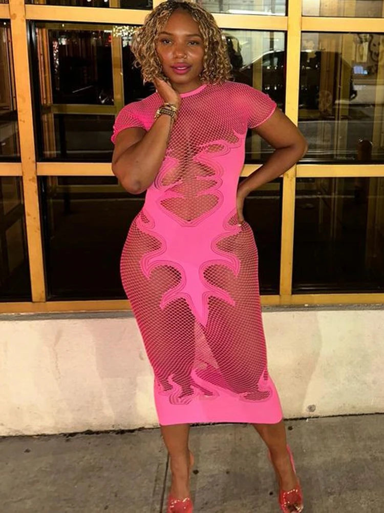 See Through High Stretch Long Dress for Women Fashion O Neck Short Sleeve Slim Bodycon Robes Sexy Club Party Dresses