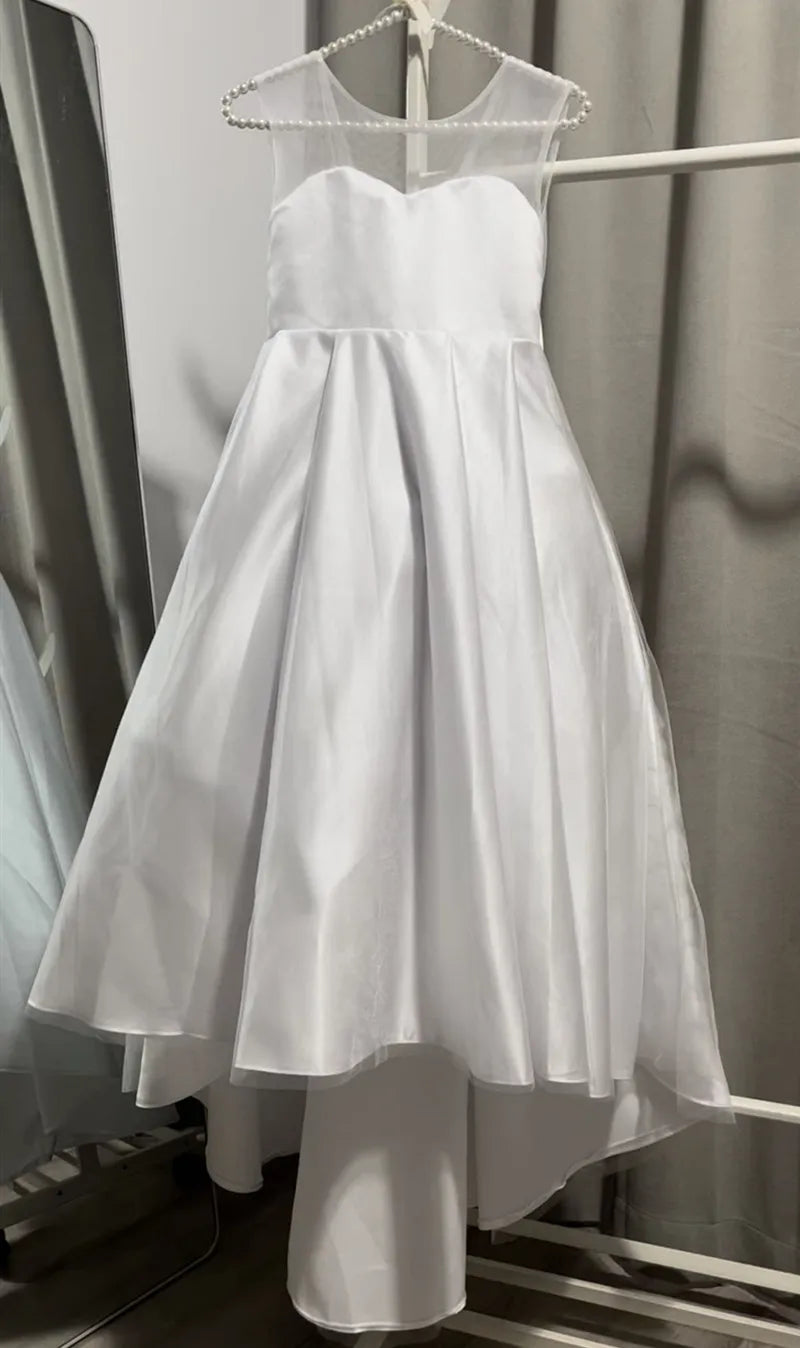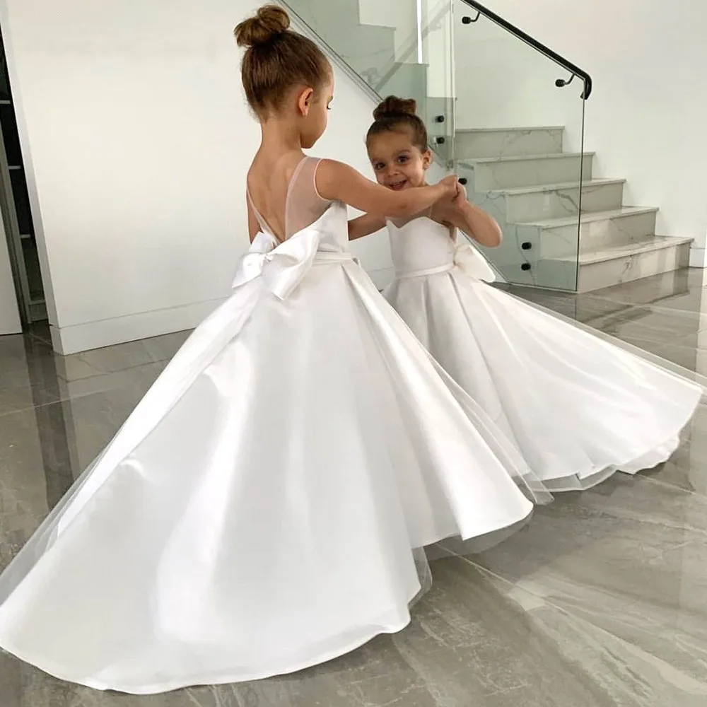 Elevate your little girl's look with this simple yet elegant white flower girl dress. The A-line silhouette, satin fabric, and tulle bow detail create a timeless and sophisticated style, perfect for weddings, bridesmaids, pageants, and first communion ceremonies. Let her shine in this beautiful gown that exudes purity and grace, making her stand out on any special occasion.