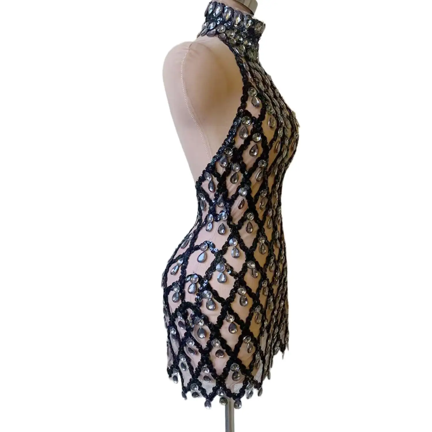 Glamorous High Neck Rhinestone Bodycon Mini Dress - Sheer Organza Sparkling Evening Wear for Trendsetting Women