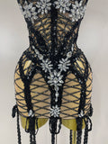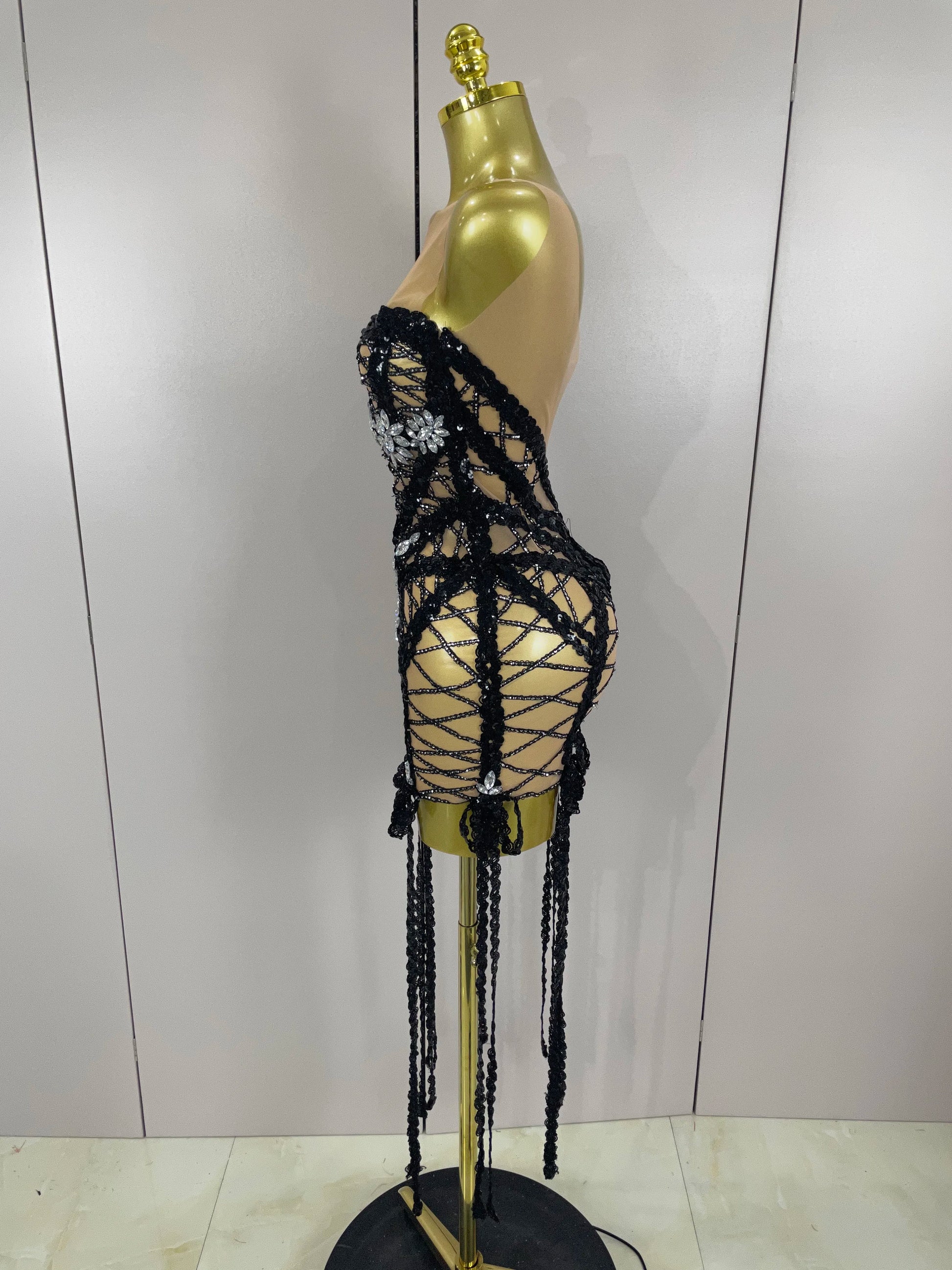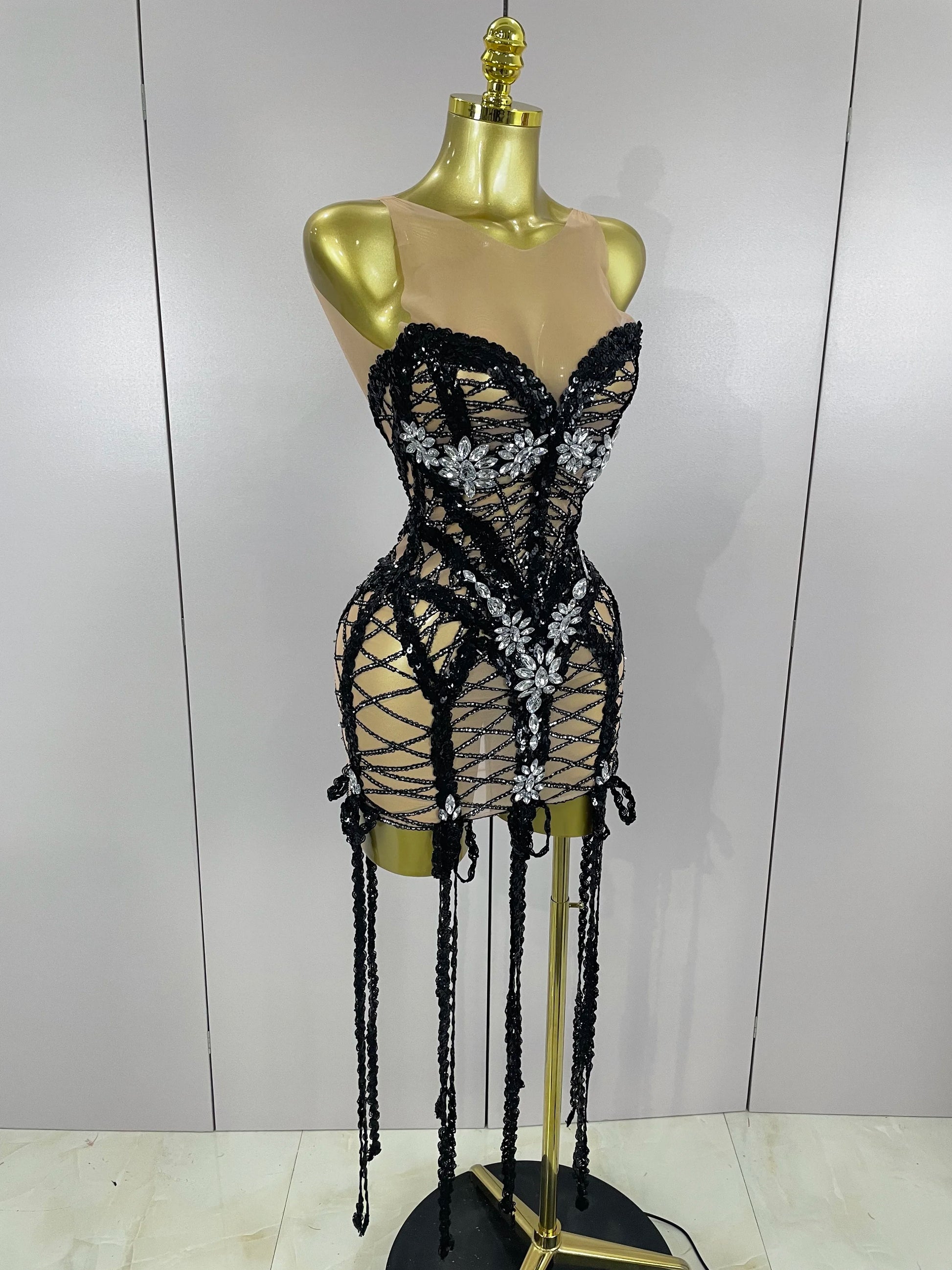 A show-stopping sleeveless mini dress covered in sequins and diamond-style rhinestones with long tassels for dramatic movement — designed for red carpet appearances, stage performances, photoshoots, and any moment you want to perform like a goddess.