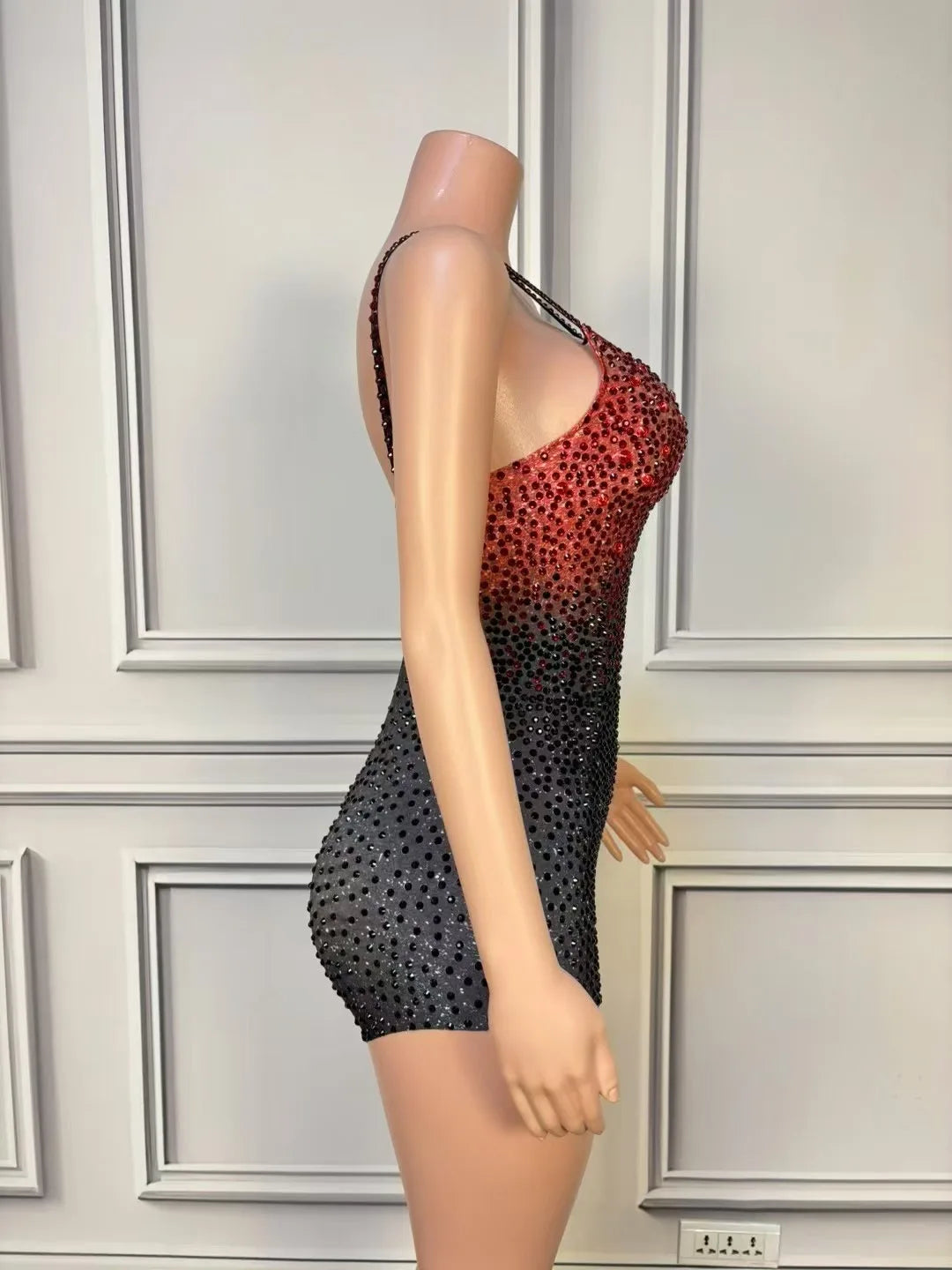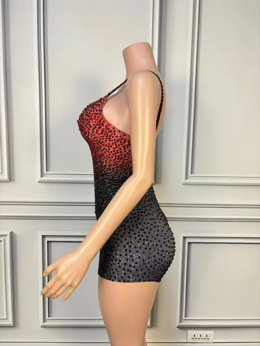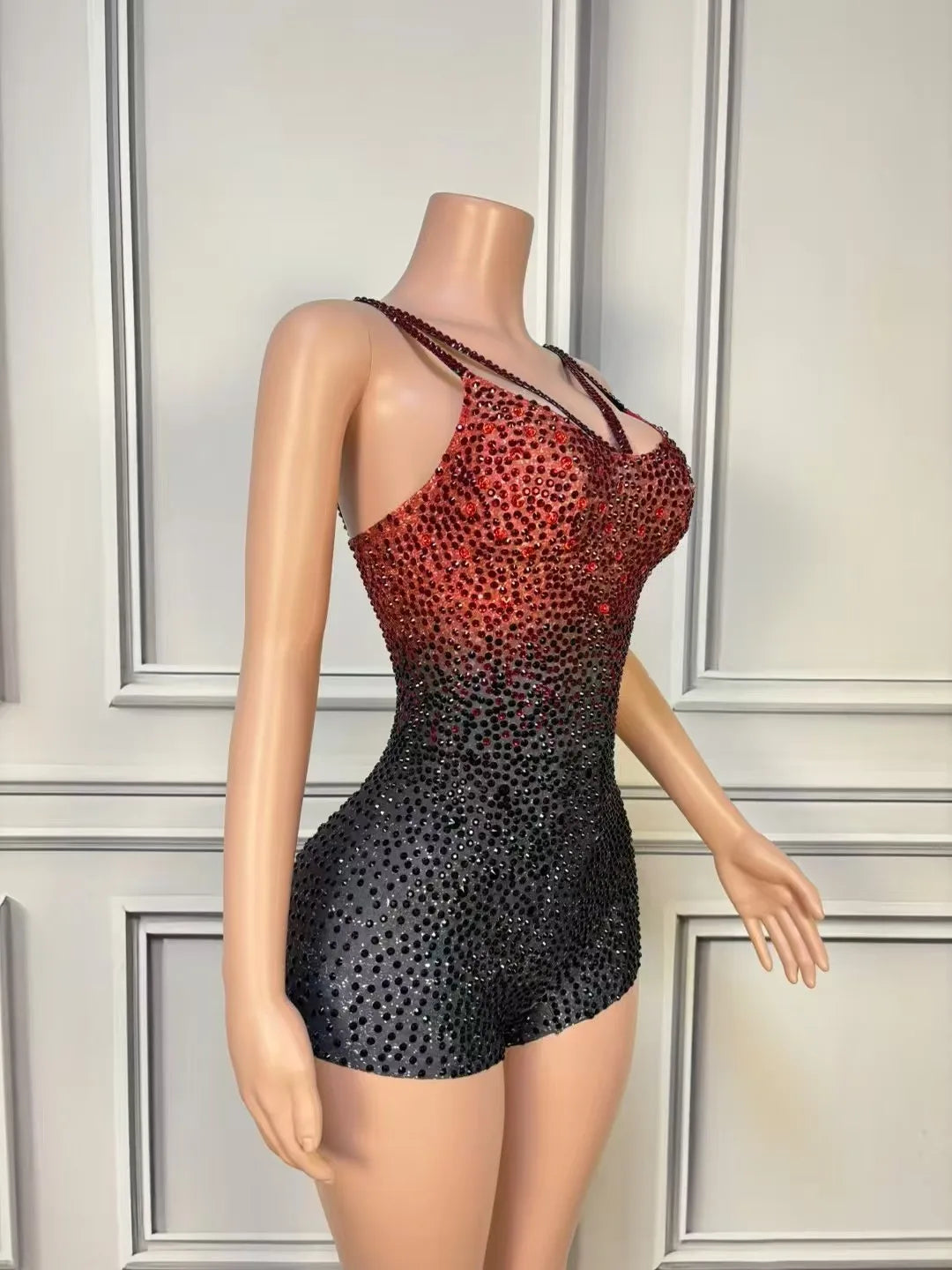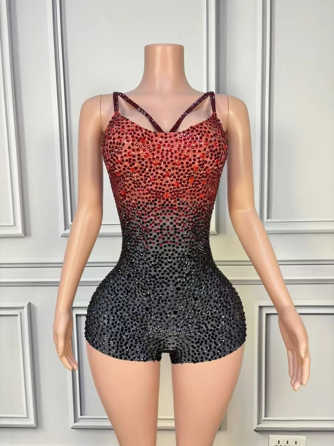 Dazzle the crowd in this sparkly black and red rhinestone bodysuit, designed for women who love to stand out. Featuring a sexy sleeveless cut and a stretch fit that hugs your curves, this glamorous costume is perfect for nightclub performances, stage shows, dance routines, and eye-catching photoshoots. The bold combination of black and red rhinestones adds striking sparkle, ensuring you shine under the lights at any event.