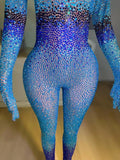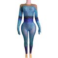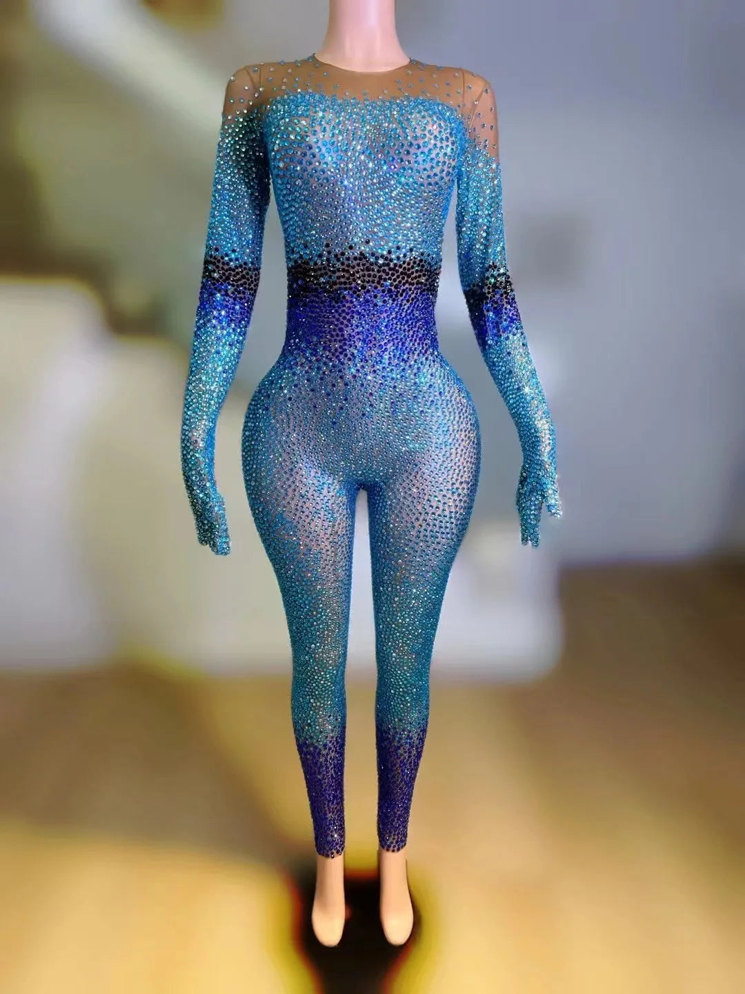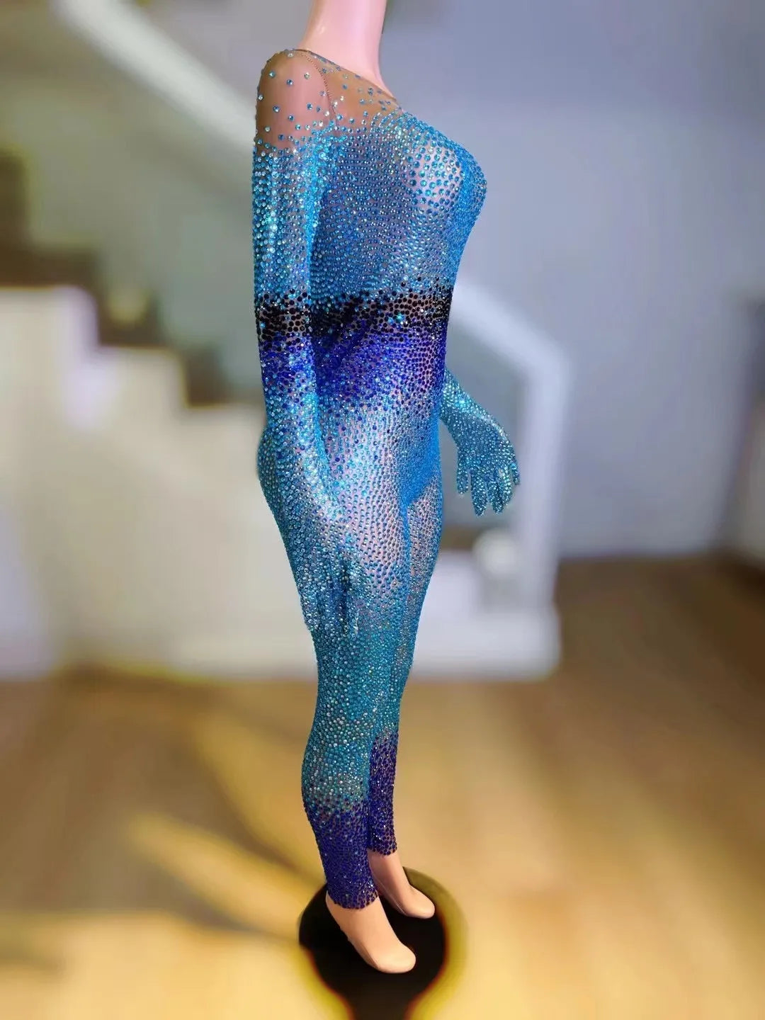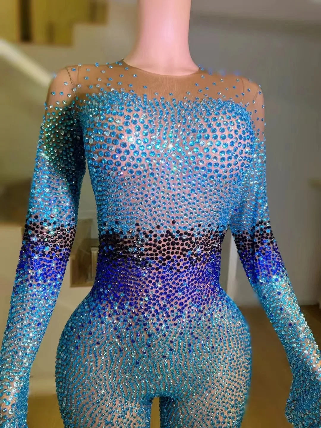 Sparkly Blue Rhinestones Jumpsuit Women Stretchy Bodysuit Nightclub Party Outfit Singer Dancer Performance Photoshoot Costume
