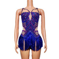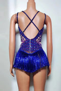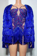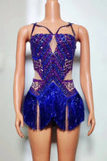 Sparkly Blue Rhinestones Tassels Bodysuit Women Sexy Performance Dance Costume Nightclub Singer Dancer Stage Photoshoot Wear